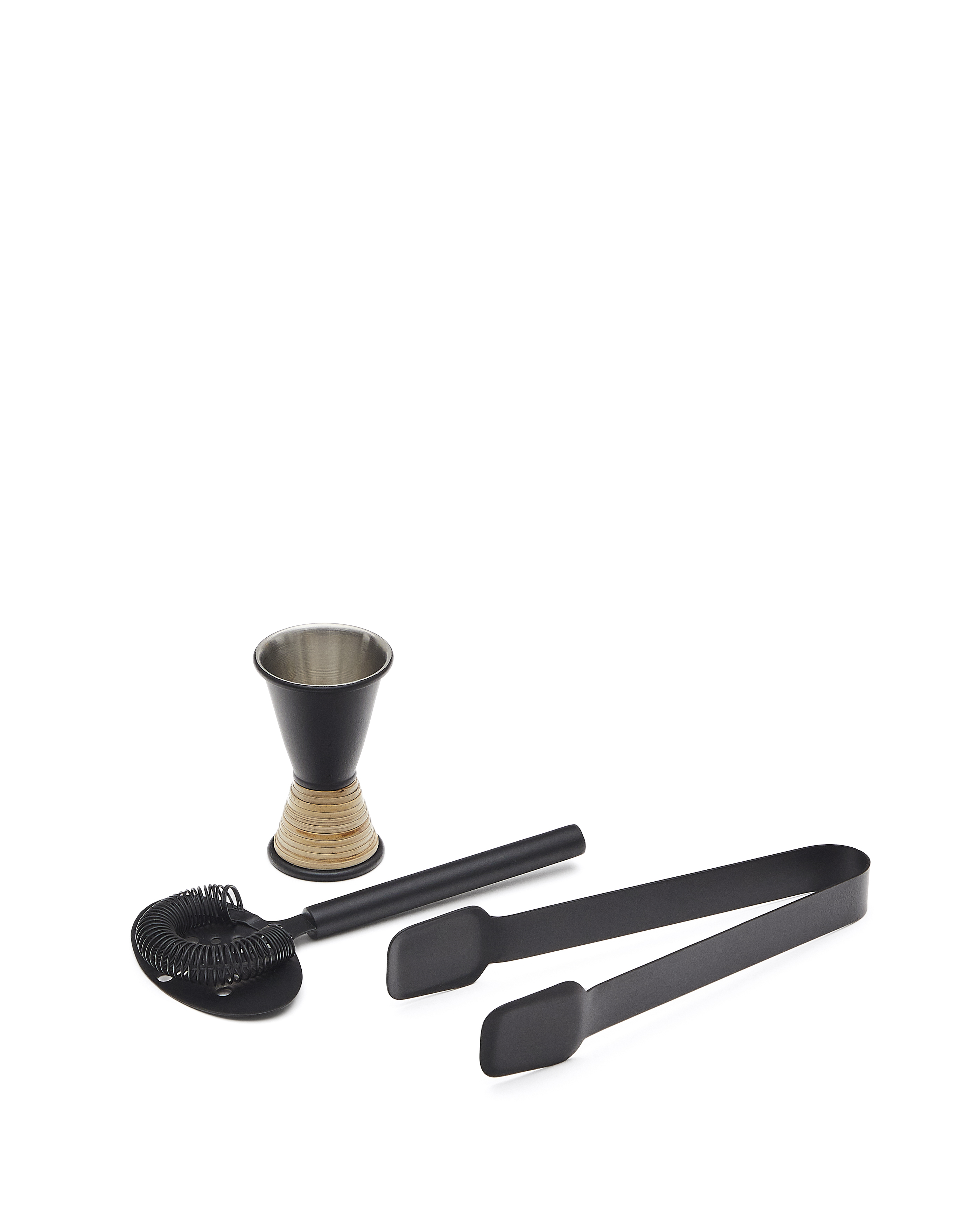 Shai set of black stainless steel and rattan cocktail utensils