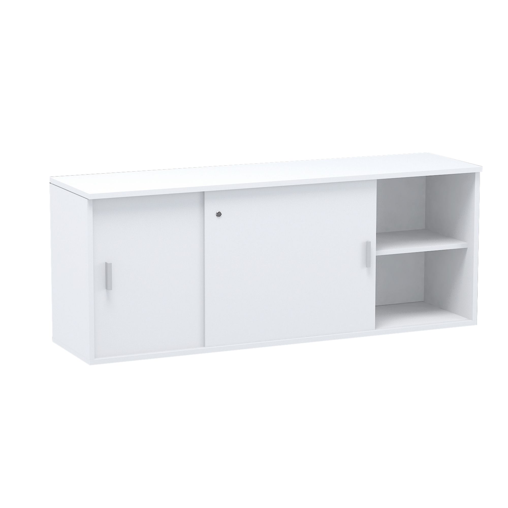 Particle board melamine panels. Central partition forming 2 compartments with 1 removable shelf each. Sliding doors with lock (2 keys provided). Brushed aluminum metal handles.