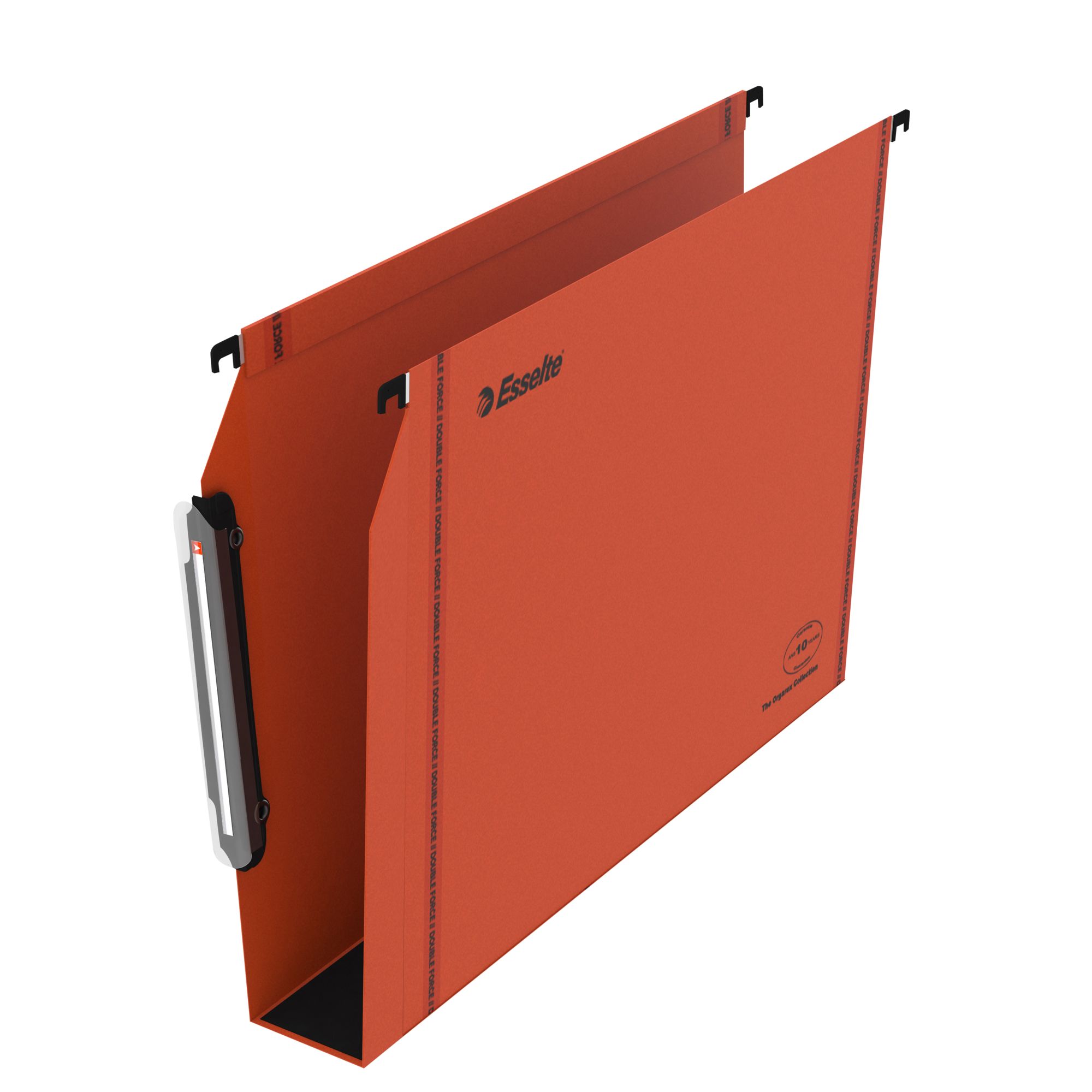 Continuous system by metal push buttons avoids the loss of files. Double strong strenghtening band for an excellent durability of the file. Flat metal bar, plastic endings. Kraft cardboard 240 g 100% recycled, certified Blue Angel and FSC Recycled.