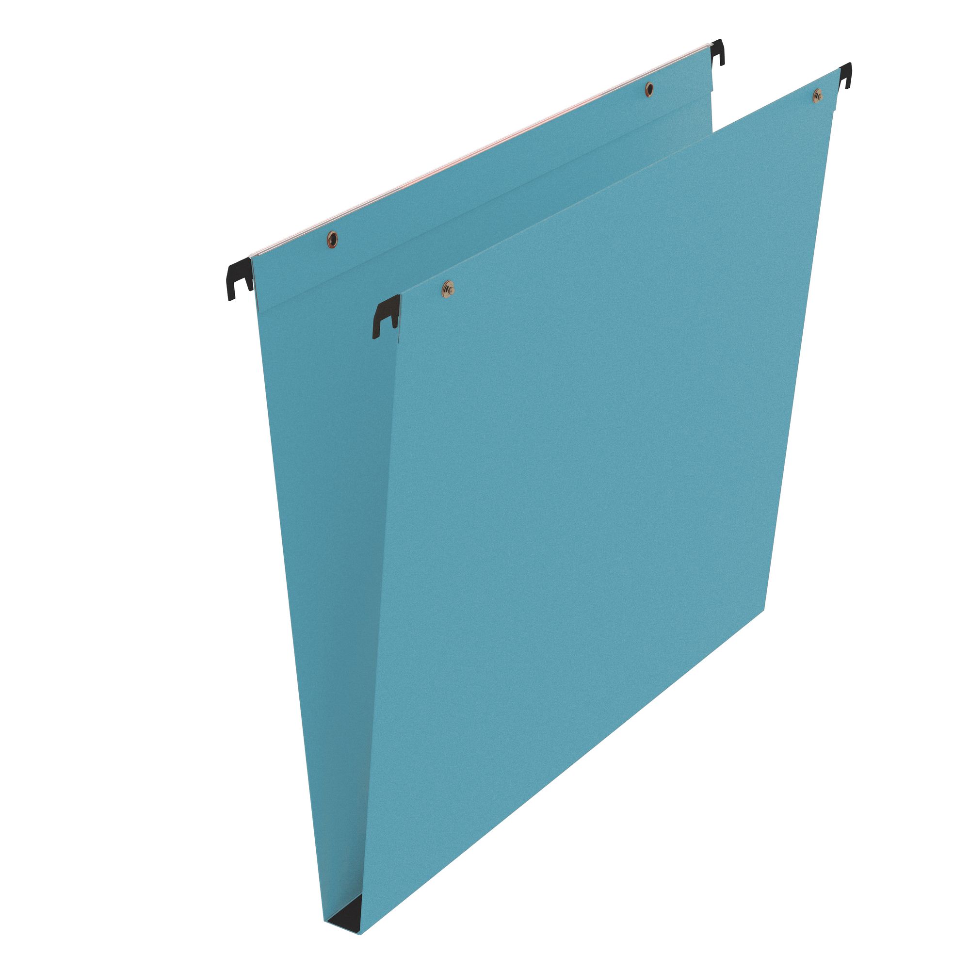 For drawers. Label holder with magnifying effect (labels are deliverd). Mixed continuous system with stapling flap and push buttons, for a universal compatibility. Hanging rods with plastic ends. With metallic push buttons. Kraft cardboard 220 g. Size 24 x 32 cm. Axis distance 33 cm. Bottom 15 mm. 4 available colours: blue, red, yellow, green.