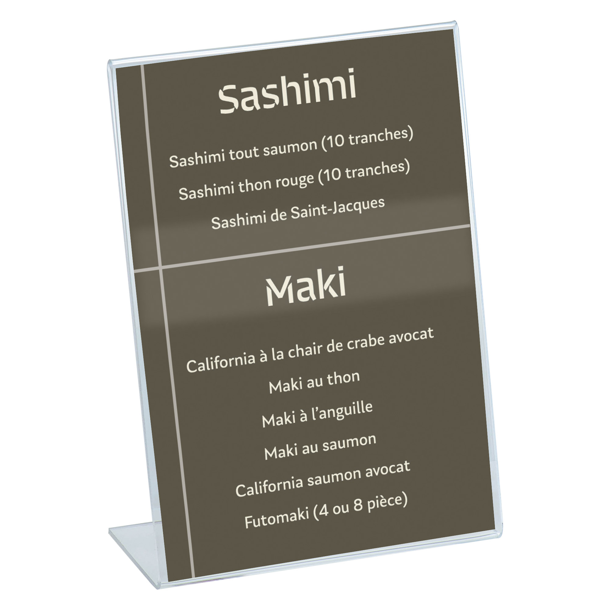 Detailled descriptionSur une table ou un bureau d'accueil, votre affichette sera bien visible grâce à ce présentoir transparent. Sa forme inclinée permet une lecture facile et son socle en polystyrène cristal est très stable.Bien présenté pour une visibilité maximale ! Valorisez à moindre coût un message avec le présentoir de table. L’insertion du document papier format A6 se faisant par l’ouverture en côté, à l'abri de la poussière ou l'humidité. Dimensions du présentoir : H 15,1 x L 10,6 x P 4,5 cm.