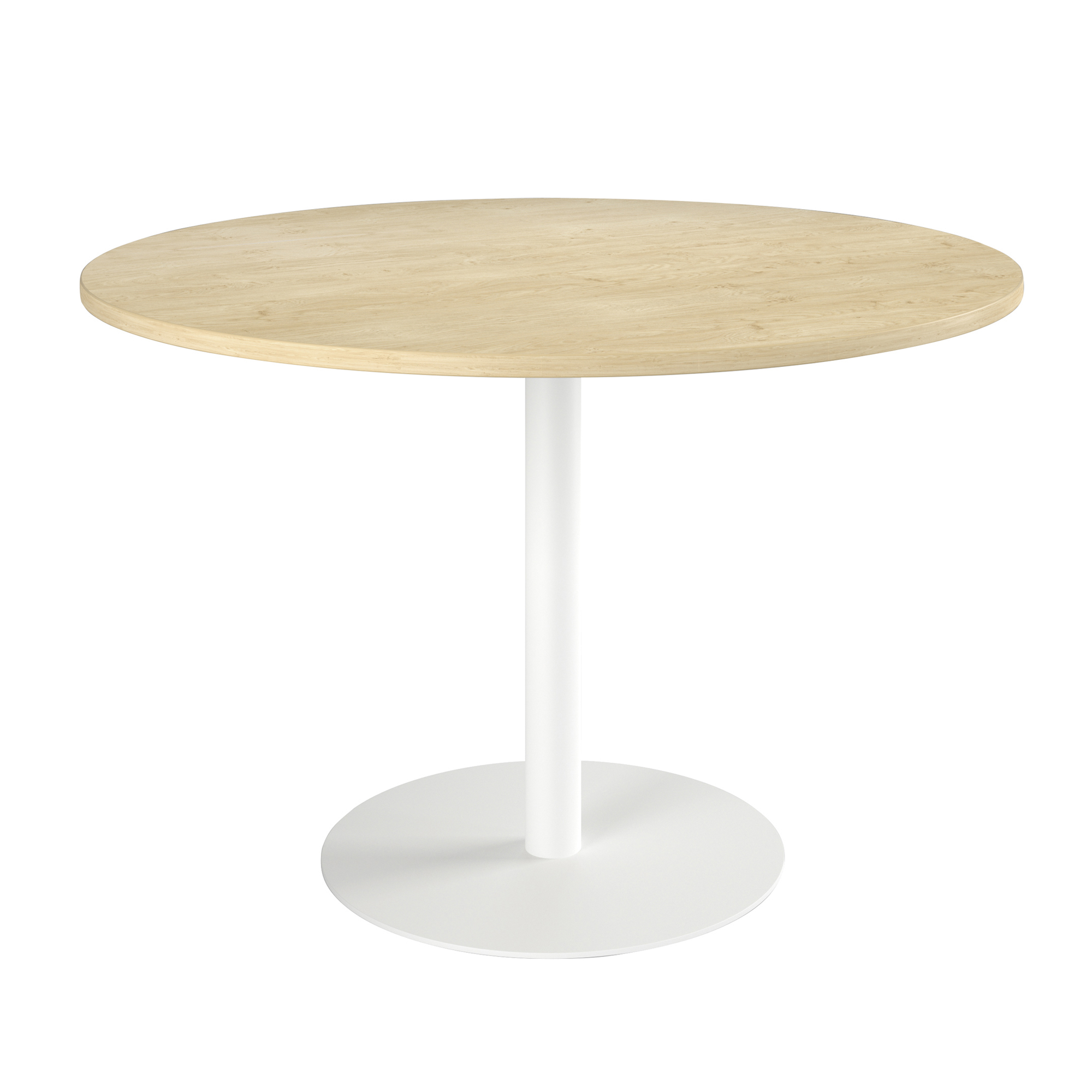 Top in laminated chipboard, with thickness of 25 mm. Shock-resistant, straight ABS borders, with thickness of 2 mm. Epoxy lacquered, column-shaped undercarriage in white, with basis Ø 60 cm. Column-shaped leg with Ø 60 mm. Top Ø 120 cm. H 76 cm.