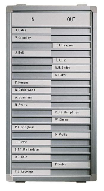 Detailled description* Informe sur les présences et les absences. * Cadre en aluminium anodisé avec coins en plastique gris clair. * Livré avec le kit de fixation et des plaques nominatives unis.