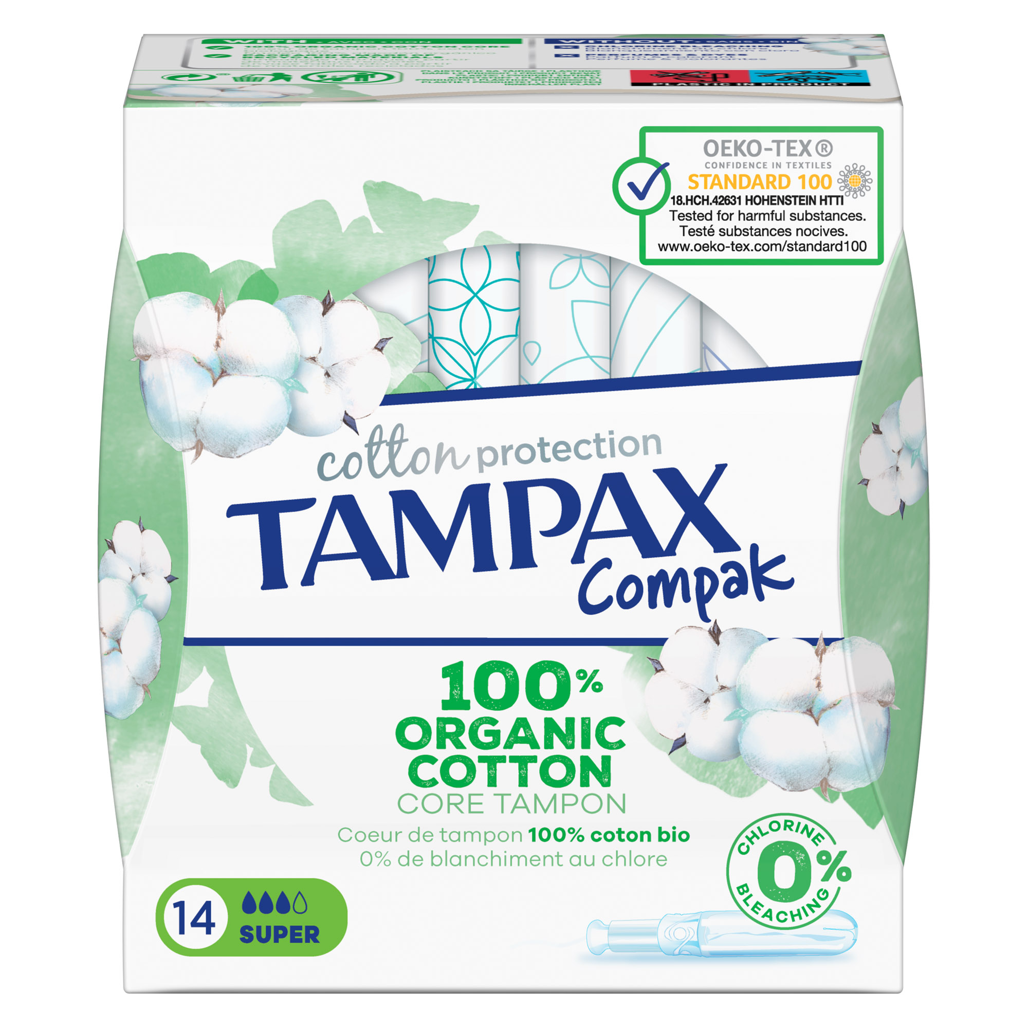Detailled descriptionLe tampon Tampax avec un cœur 100 % coton biologique.La technologie MotionFit de Tampax permet au tampon d’épouser délicatement la forme unique de votre corpsLa tresse anti-fuites LeakGuard offre une protection supplémentaireSans parfum, colorant, ni blanchiment au chloreProtection SuperContrôlés OEKO-TEX STANDARD 100 Boîte de 14.