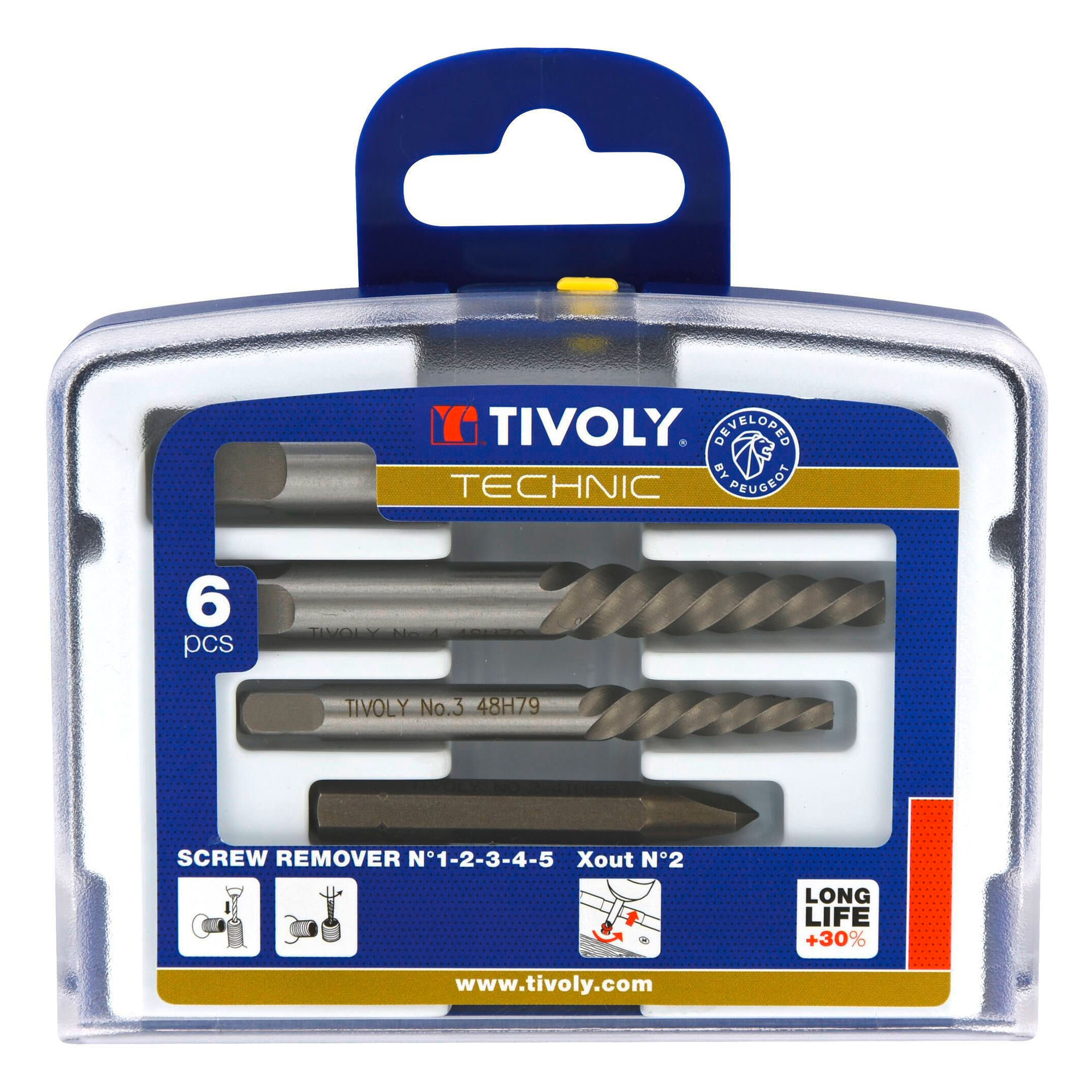 Ideal for easily removing broken or damaged screws and studs, this kit contains 5 sturdy extractors (no.1 to 5) and 1 X-out extractor no.2.