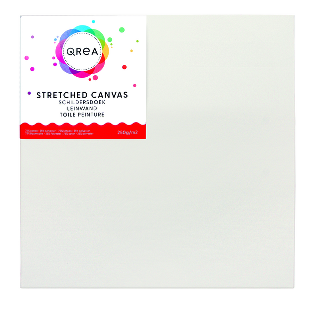 Toile à peindre Qrea Studio 30x30cm.Libérez votre créativité avec la toile à peindre de Qrea Studio. Produite en Europe, cette toile de haute qualité constitue une base solide pour vos projets de peinture. La toile blanche est composée d'un matériau de 250 grammes (75% de coton, 25% de polyester) et est doublement apprêtée avec du gesso pour une excellente adhérence de la peinture. La toile est tendue sur un solide châssis en bois de 2,3cm d'épaisseur et agrafée au dos, ce qui permet de peindre également les côtés recouverts. La toile peut être utilisée entre autres avec de la peinture acrylique et de la peinture à l'huile. Elle est disponible en différentes formats pour tous les types d'œuvres d'art.Caractéristiques :* Format : 30x30cm.* Couleur de la toile : blanc.* Poids de la toile : 250 grammes.* Matériau : 75% coton, 25% polyester.* Préparation : double gesso.* Cadre en bois massif, 2,3cm d'épaisseur.* Convient pour : peintures à l'huile et acryliques.* Origine : produit en Europe.* Extra : disponible en différents formats.