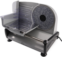 Detailled descriptionTrancheuse électrique, lame en acier inoxydable recouverte de céramique, épaisseur de coupe ajustable en continu de 0 à 15 mm, verrou de sécurité, interrupteur marche/arrêt, dimensions: (L)360 x (P)225 x (H)265 mm, couleur: gris prise euro