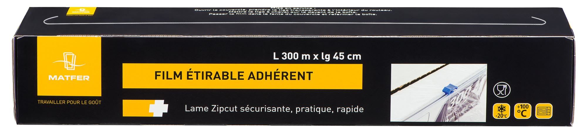 Stretch film in PVC in a cardboard dispenser box with Zipcut cutting system.