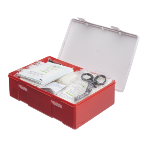 * Trousse de secours avec support mural. * 2 pansements d’urgence 6x8cm. * 4 pansements d’urgence roulés 6x8cm. * 2 pansements d’urgence 8x10cm. * 16 compresses stériles 1/16. * 10 compresses stériles 5x5cm. * 2 compresses non adhérentes moyennes. * 1 pincette. * 3 épingles de sûreté. * 1 paire de ciseaux Lister en acier inoxydable. * 3 bandages élastique hydrophile 6cm. * 2 bandages élastique hydrophile 8cm. * 1 boîte de sparadrap 50x6cm. * 1 jeu de 4 gants jetables. * 1 rouleau de ouate synthétique 300x10cm. * 1 rouleau sparadrap large 500x2,5cm. * 1 masque bouche à bouche. * 1 écharpe triangulaire. * 1 sachet de ouate blanche 25g. * 1 désinfectant 10cc.