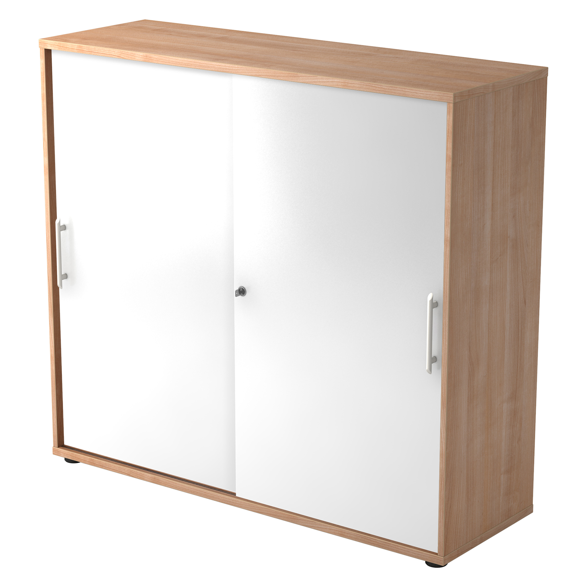 Structure: laminated chipboard (DIN 68765 - E1 category). Front side with 2 mm thick ABS protective strip. Side panels : 16 mm thick, top and lower panels: 22 mm thick. Back: 3 mm (screwed down in grooves) - silver coloured.Lock: "Slide Line" at the bottom on 2 wheels per door in rail (adjustable in height) - on top with 2 blocks per door in rail.Equipment: shelves: 16 mm thick, front side with 2 mm thick ABS protective strip. Adjustable in height every 32 mm. Base: 5 round legs (black - H : 20 mm), on top adjustable in height through bottom.Lock: one cylinder lock for both doors (2 separate locks on demand).Handle: in silver coloured plastic, 128 mm. Carrying capacity: 25 kg/shelf.