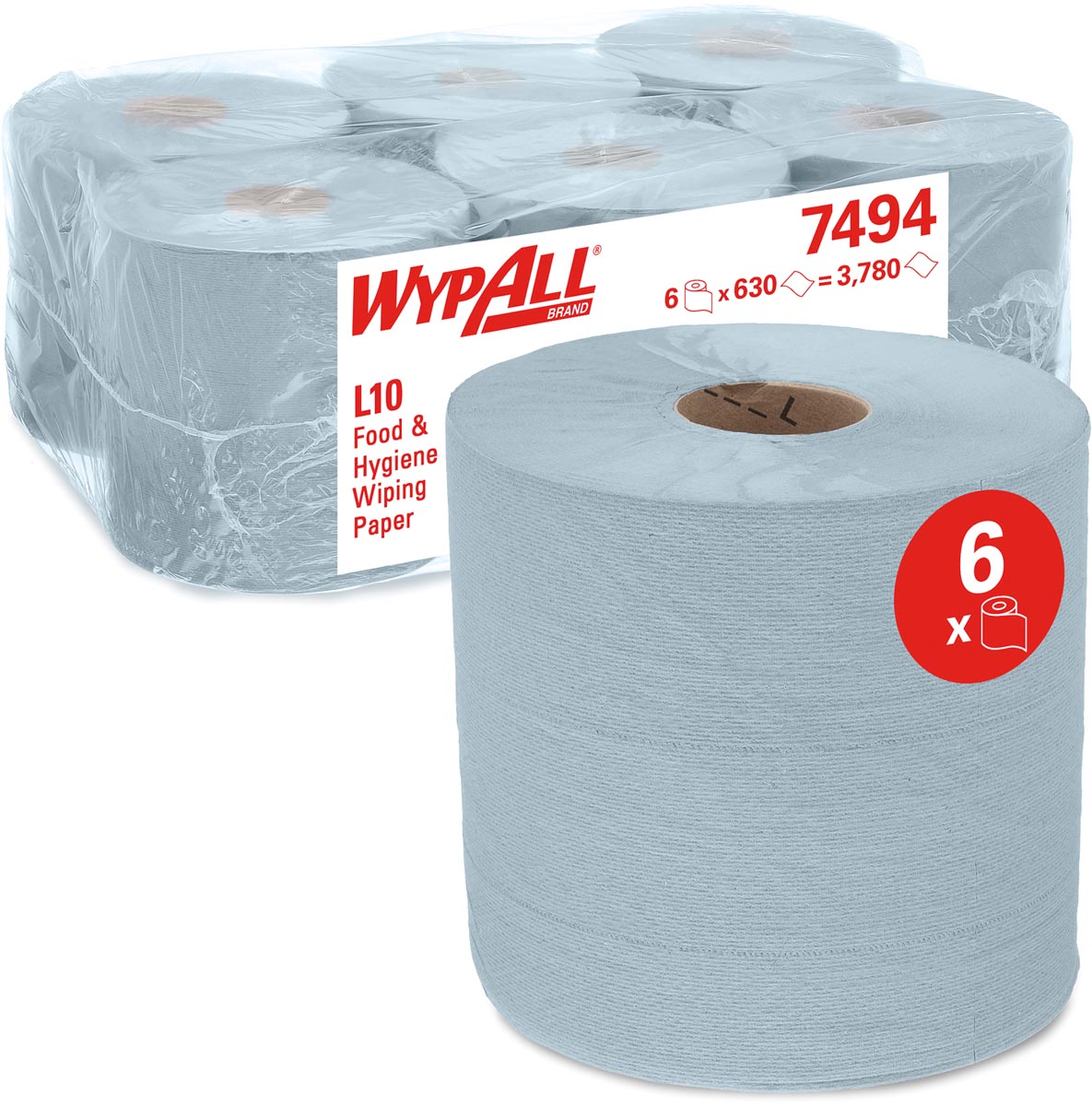 * Essuyeurs WhypAll L10 pour le secteur de la restauration et des soins personnels 7494, 6 rouleaux x 630 essuyeurs bleus (au total 3780 essuyeurs). * Quelles que soient les surfaces avec lesquelles ils sont en contact tout au long de la journée, favorisez la tranquillité d'esprit de vos employés et de vos visiteurs en leur fournissant des solutions éprouvées d'hygiène sur le lieu de travail pour aider à briser la chaîne de transmission des germes. * Les essuyeurs WypAll® L10 pour l'hygiène et les surfaces alimentaires sont conçus pour effectuer toutes vos tâches d'essuyage à la perfection. * Ces rouleaux à dévidage central perforés feuille à feuille bleus embossés du logo de la marque sont de taille moyenne, avec une grande capacité. * Les rouleaux d'essuyeurs compressés avec davantage de feuilles par rouleau permettent d'espacer le remplissage et le transport des produits pour atteindre des normes de développement durable plus élevées et réduire les émissions de CO2 et les déchets. * Notre technologie Airflex™ unique procure solidité et absorption exceptionnelles à chaque essuyeur en papier et le rouleau bleu est conçu pour être facilement détectable dans les environnements où les risques de contamination sont élevés. * Les rouleaux de papier essuie-tout simple épaisseur polyvalents peuvent être utilisés avec ou sans distributeur pour répondre à vos besoins. * Les rouleaux d'essuyeurs pour l'hygiène et les surfaces alimentaires WypAll® L10 sont compatibles avec notre distributeur portable WypAll® ReachPlus™ (6521) et les distributeurs d'essuyeurs muraux Aquarius™ Roll Control™ en blanc (7018) et gris (7181), avec de nouvelles pièces détachées bleues (à commander séparément). * Ces distributeurs d'essuyeurs faciles à nettoyer et à chargement rapide offrent des solutions de distribution feuille à feuille plus fiables. * La distribution feuille à feuille réduit le nombre de feuilles utilisées tout en garantissant que l'utilisateur ne touche que la feuille dont il a besoin, ce qui garantit une hygiène maximale et un meilleur contrôle des coûts. * Ce rouleau bleu WypAll® peut être utilisé une fois avec un détergent ou un désinfectant. * Des tests ont prouvé que ces essuyeurs Kimberly-Clark™ sont compatibles pour une utilisation en pulvérisation et en essuyage avec de l'acide peracétique, du peroxyde d'hydrogène et des quats (composés d'ammonium quaternaire). * La compatibilité pour la pulvérisation et l'essuyage permet de s'assurer que les employés peuvent nettoyer leurs propres espaces de travail, véhicules, bureaux, sièges et zones de préparation des aliments avant et après utilisation. * L'association d'essuyeurs et de produits à pulvériser permet également aux travailleurs de la production de nettoyer/désinfecter les postes de travail individuels avant de passer au quart suivant. * Suivez toujours les instructions du fabricant pour la dilution, l'application et le temps de contact. * Les rouleaux WypAll® L10 à dévidage central pour l'hygiène et les surfaces alimentaires sont conçus pour l'essuyage léger et le nettoyage de surfaces de préparation alimentaire et de service. * Chaque essuyeur est adapté au contact avec les aliments et mesure (Lxl) 38x18,3cm.