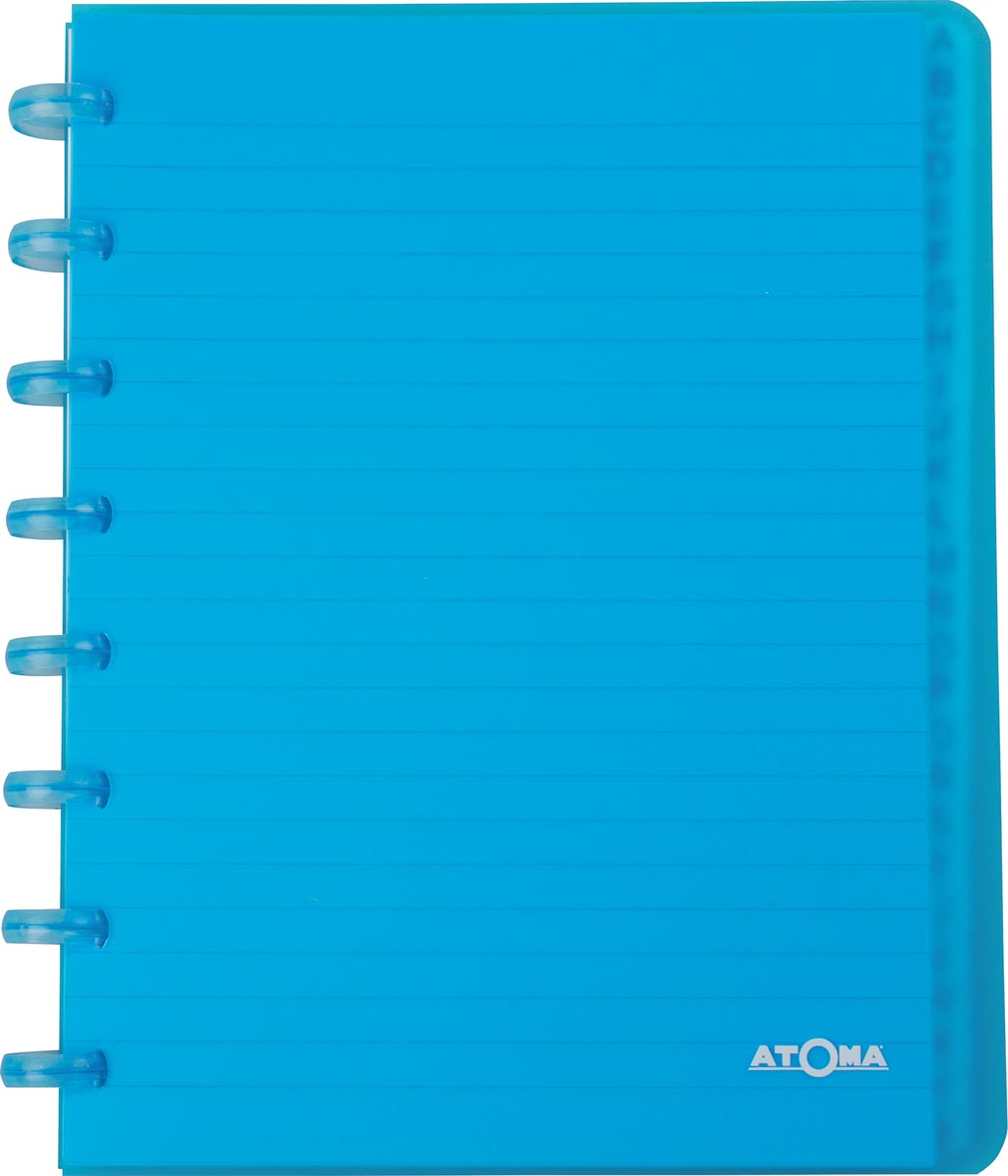 ProductinformatieVoor ft A5. 108 bladzijden (54 vel). Cover in PP. In transparante geassorteerde kleuren: blauw, groen, paars, rood, turkoois. Certificaat: FSC Mix