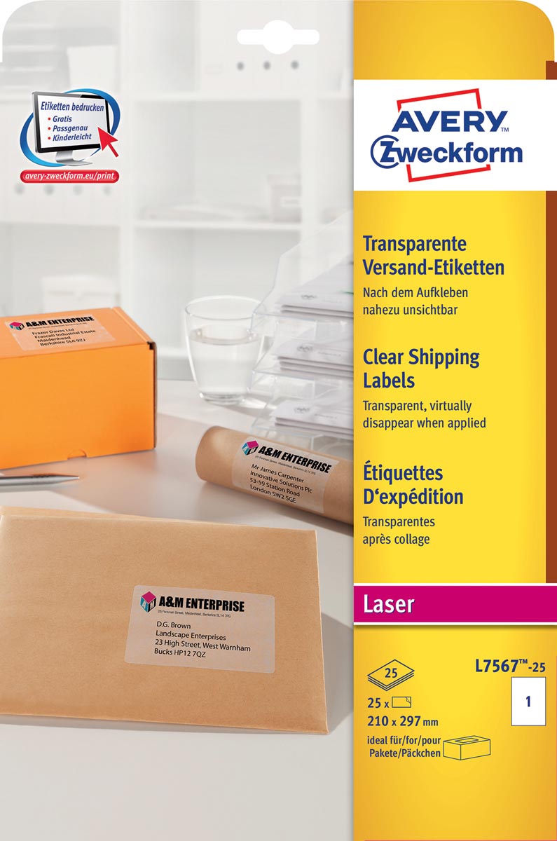 Doos van 25 vel. Transparante etiketten zijn praktisch onzichtbaar als u ze ergens heeft opgeplakt. Door de perforatielijn los te trekken komen de etiketten gedeeltelijk vrij, waardoor deze nog eenvoudiger van het etiketvel kunnen worden gehaald. Met QuickPEEL om de etiketten eenvoudiger van het vel te halen. Voor laserprinters. Makkelijk te ontwerpen en te bedrukken dankzij de gratis Avery Design & Print software.