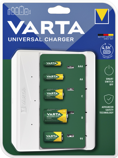 * Batterij oplader Varta Universal voor AA/AAA/C/D/E batterijen. * Gebruik deze batterijenlader om 2 of 4 AA, AAA, C en D of 1x E (9V) NiMH batterijen tegelijk op te laden. * Druppellader: zorgt ervoor dat de batterijen niet langzaam leeglopen. * Groene LED's voor oplaadindicatie. * Beveiliging tegen het verkeerd aansluiten van accupolen. * Beveiliging tegen kortsluiting. * Detecteert alkalische batterijen en batterijen met slechte cellen. * Voeding via USB-C aansluiting (5V/1A). * Inclusief USB-C naar USB-A kabel. * Levering betreft alleen lader (zonder batterijen).