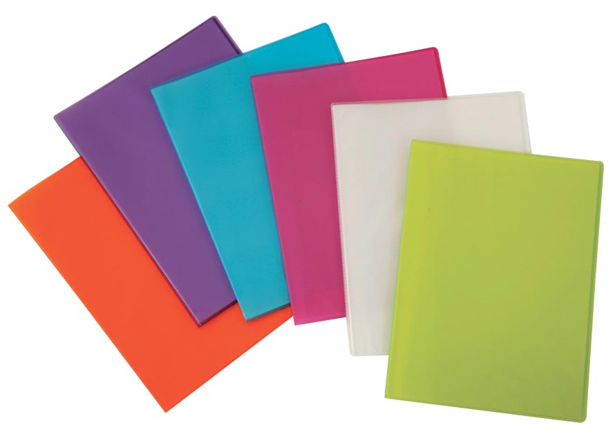 ProductinformatieVoor ft A4. Met vaste tassen. Geassorteerde transparante kleuren: transparant, oranje, rood, paars, groen en blauw.