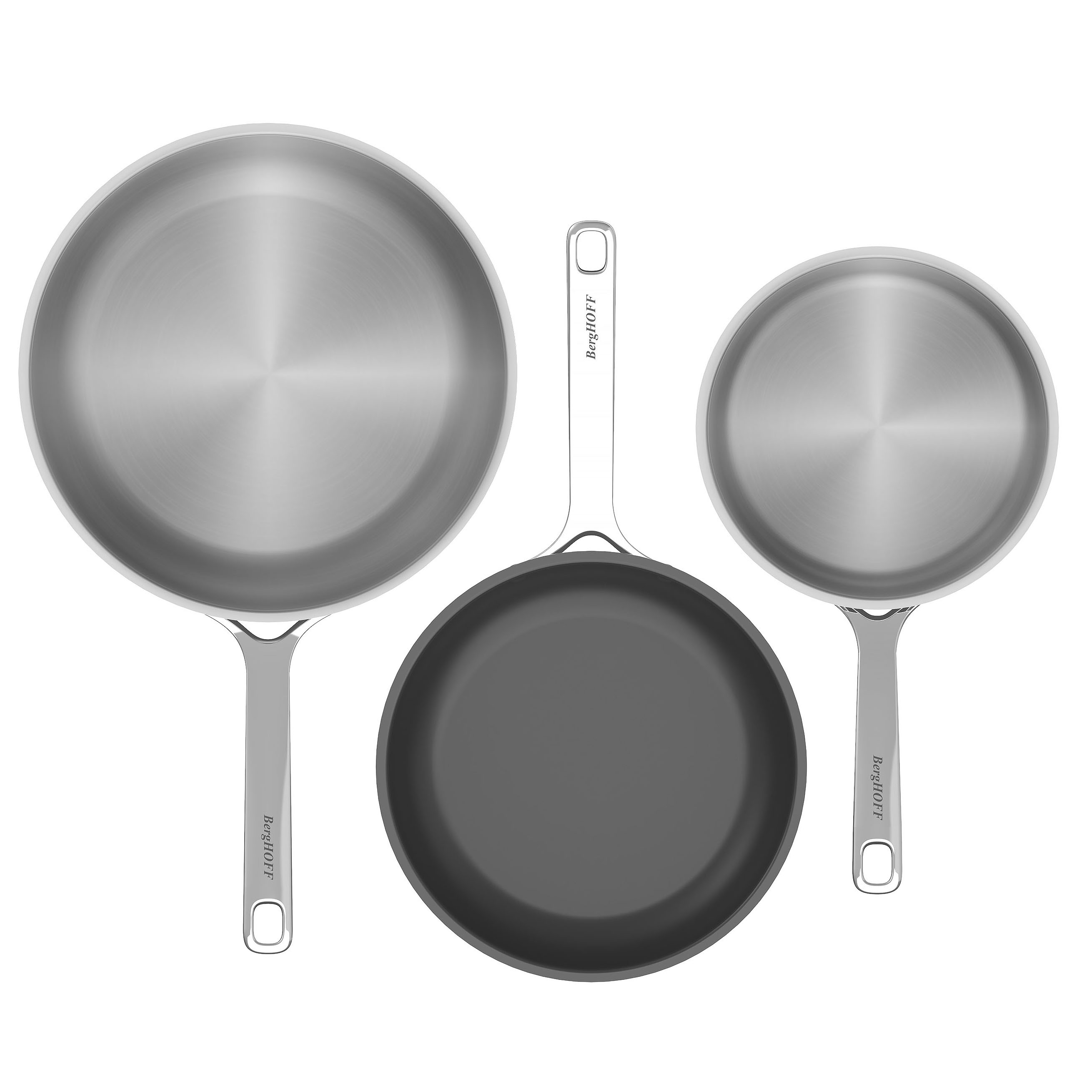 Deze set bestaat uit 3 koekenpannen (20, 24 en 28 cm) van gerecycleerd roestvrij staal met een stijlvolle satijnen afwerking. De koekenpan van 24 cm is voorzien van een keramische CeraGreen antiaanbaklaag, ideaal om met weinig tot geen olie te koken en makkelijk schoon te maken. Alle pannen kunnen in de oven tot 230°C.