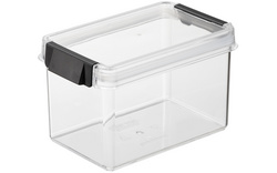 ProductinformatieRechthoekig, transparant/zwart, in SAN/siliconen, voor gebruik vanvoedsel, hermetisch deksel met clip, transparant deksel & bodem, zwarte clip, stapelbaar,afmetingen: (B)168 x (D)109 x (H)105 mm.