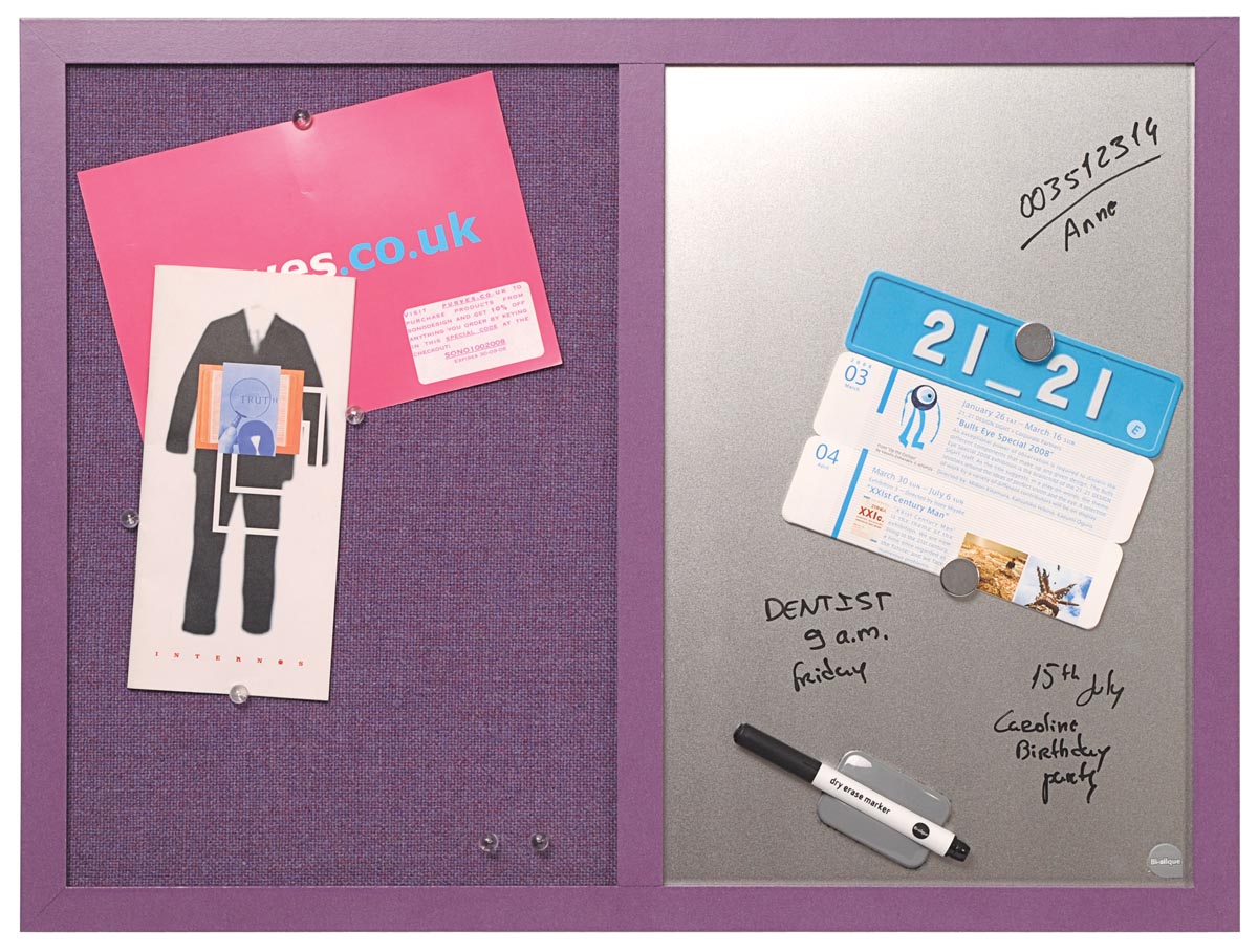 ProductinformatieFt 60 x 45 cm. Combinatiebord met op de ene helft textiel en op de andere helft een magnetisch notitiebord. Inclusief bevestigingsmateriaal en push pins.