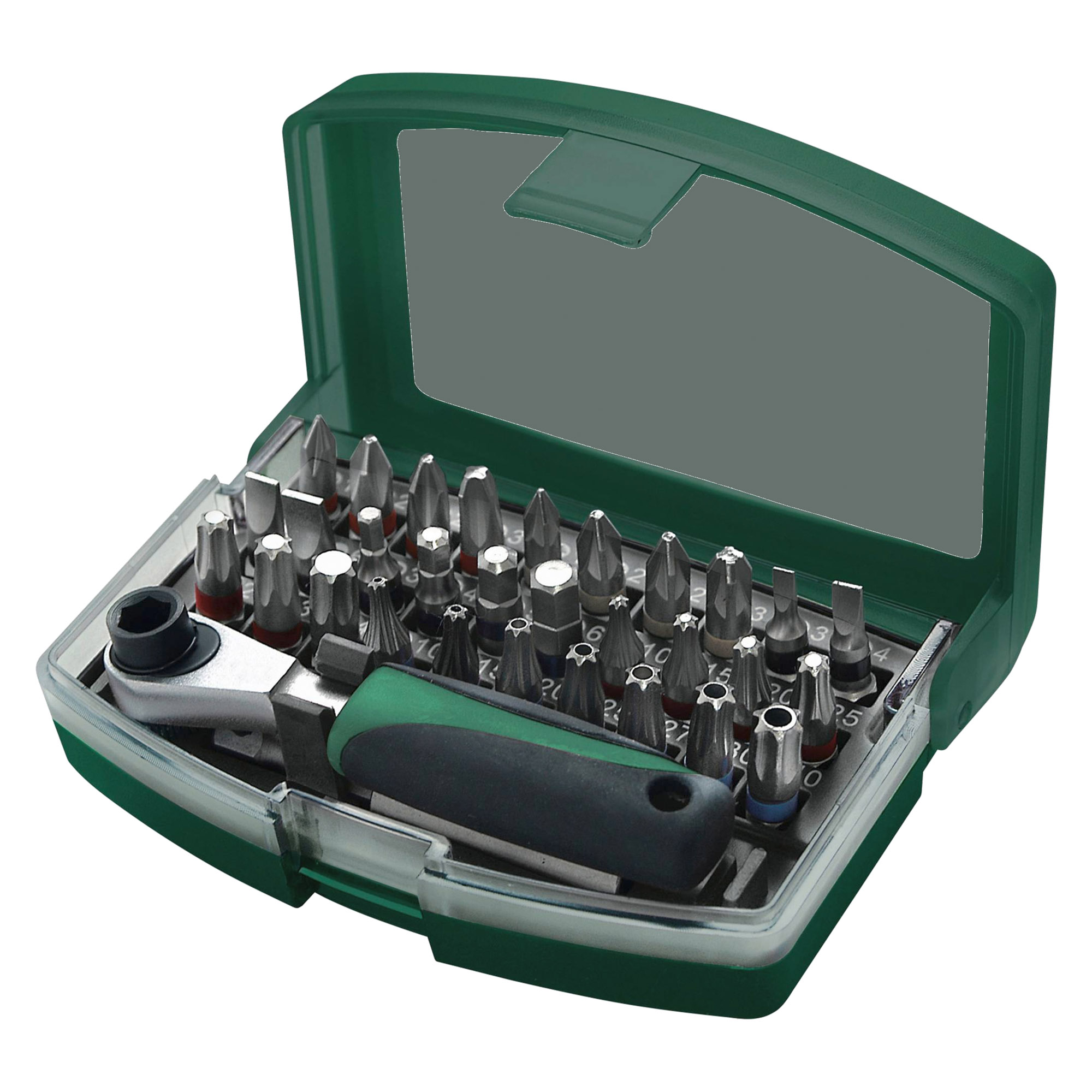 Inhoud: 4x kruiskop PH en 4x kruiskop Pozidriv, 4x sleuf en 4x inbus bits, 7x Torx en 7x Resistorx, 1x magnetische bithouder, 1x ratel met bitopname.