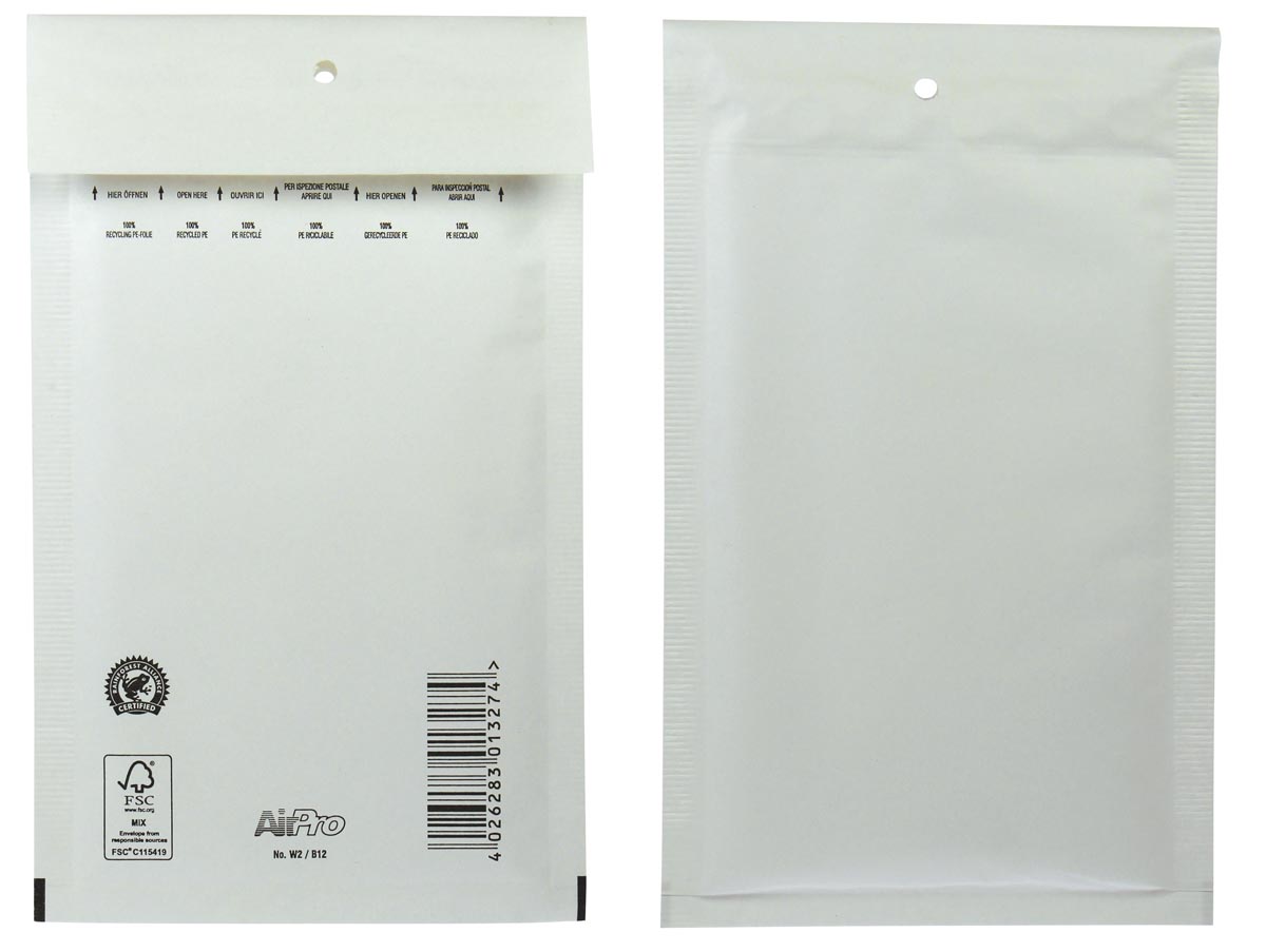 Uit wit kraftpapier van 80 g/m². Zonder venster. Met stripsluiting. Met luchtkussenfolie. FSC-gecertificeerd. Vermelde formaten zijn binnenformaten.
