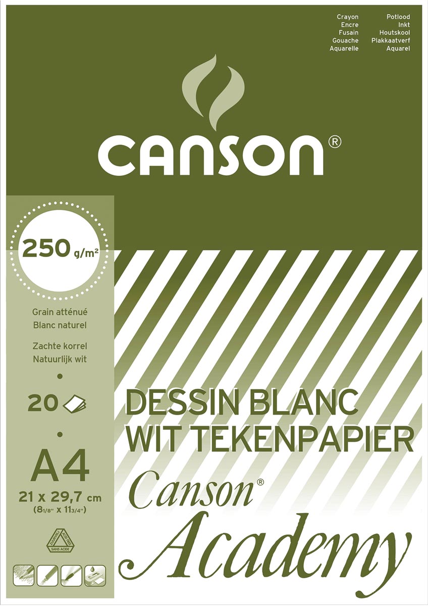 Blok van 20 vel. Papier van 250 g/m². Wit zuurvrij papier met een natuurlijke korrel. Wordt gebruikt voor droge technieken zoals potlood, houtskool of sanguine en geeft een naturel schaduweffect weer. Kan ook voor natte technieken gebruikt worden zoals plakkaat- en aquarelverf of Oostindische inkt.