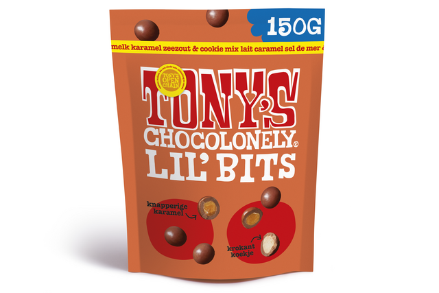 * Denk je aan Tony's, denk je natuurlijk aan.. karamel zeezout? Hoppa! Onze best verkochte reep, maar dan in het Lil'. Knapperige karamelstukjes met een dikke laag romige melkchocolade en een korreltje zout.. met ook nog een koekje d'r bij. Da's andere koek als je het ons vraagt. Enneh.. ook al zijn ze klein ze hebben grootse impact. Grabbelen maar!