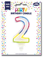ProductinformatieWitte glitterkaars met gekleurd randje, dubbelzijdig,plastic voet, op blisterkaart, afmetingen blisterkaart: (L)85 x (D)15 x (H)150 mm.
