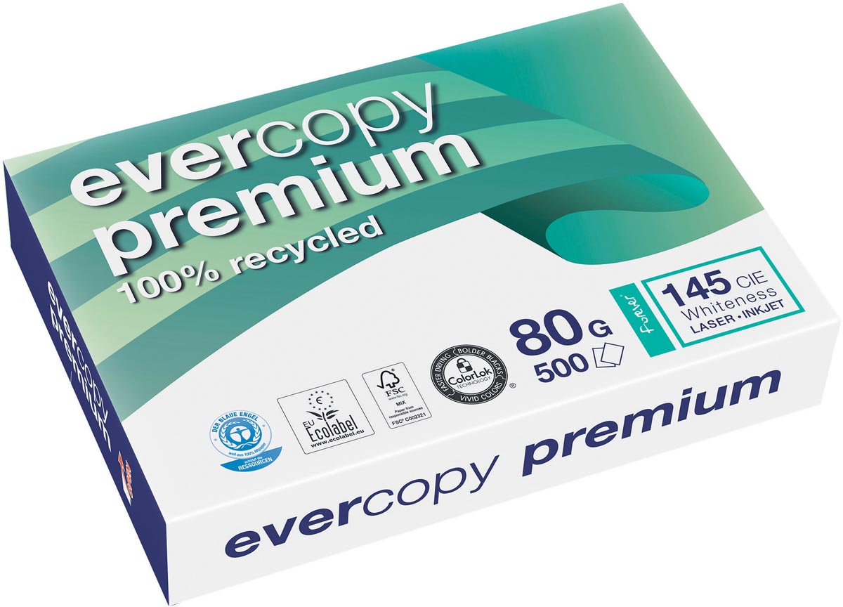 ProductinformatiePapier van 80 g/m² Voor kopieertoestellen, laser- en inkjetprinters Pak van 500 vel Ft 21 x 29,7 cm (A4) Certificaat: FSC recycled, EU Ecolabel Gerecycleerd materiaal: 100 % gerecycleerd wit papier