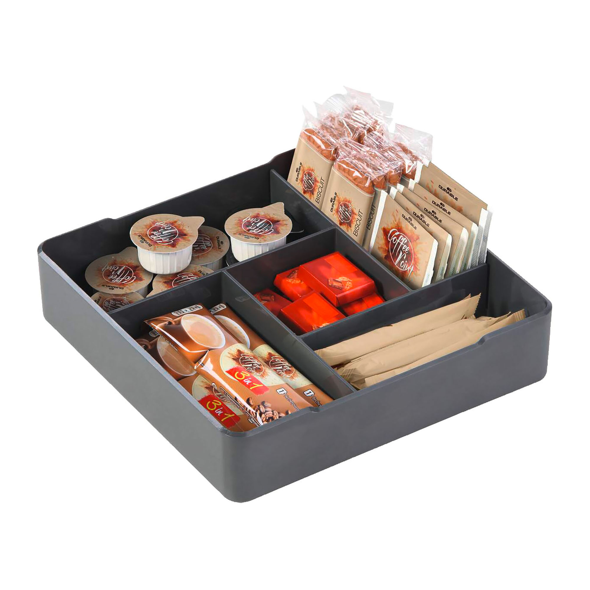 Met onderverdelingen, ideaal voor suikersticks, melkcups en andere accessoires voor koffie