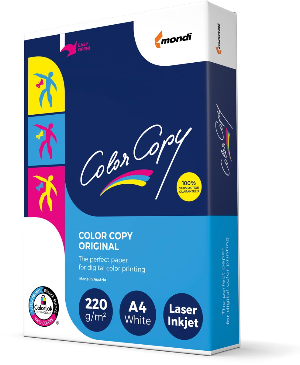 Een houtvrij, wit, ongestreken kleurenlaserpapier met een extra glad gekalanderd oppervlak. Het speciale oppervlak van Color Copy zorgt voor haarscherpe afdrukken met een briljante kleurstelling, speciaal op kopieermachines en kleurenlaserprinters. Certificaat: FSC Mix, EU Ecolabel