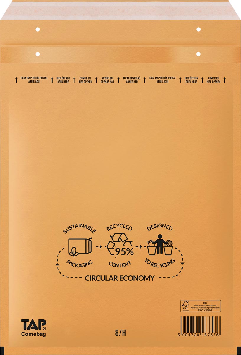 ProductinformatieUit kraftpapier van 75 g/m² met luchtkussenfoliezak (uitneembaar) Stevige envelop, met zelfklevende strip Voor 95 % uit gerecycleerd materiaal Eenvoudig te scheiden, voor apart gebruik of aparte recyclage