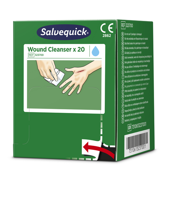* De Salvequick Wondreiniger past in het Cederroth eerstehulpstation. De Salvequick Wondreiniger vervangt watten en flessen wondreinigingsoplossing. Buigzaam en gemakkelijk te gebruiken. Goed beschermd in de verpakkingen. De reinigingsvloeistof bestaat uit een steriele fysiologische zoutoplossing.* Inhoud: 20 st. Salvequick Wondreinigers 11x12 cm (Steriele fysiologische zoutoplossing).* Soort letsel: Wonden.