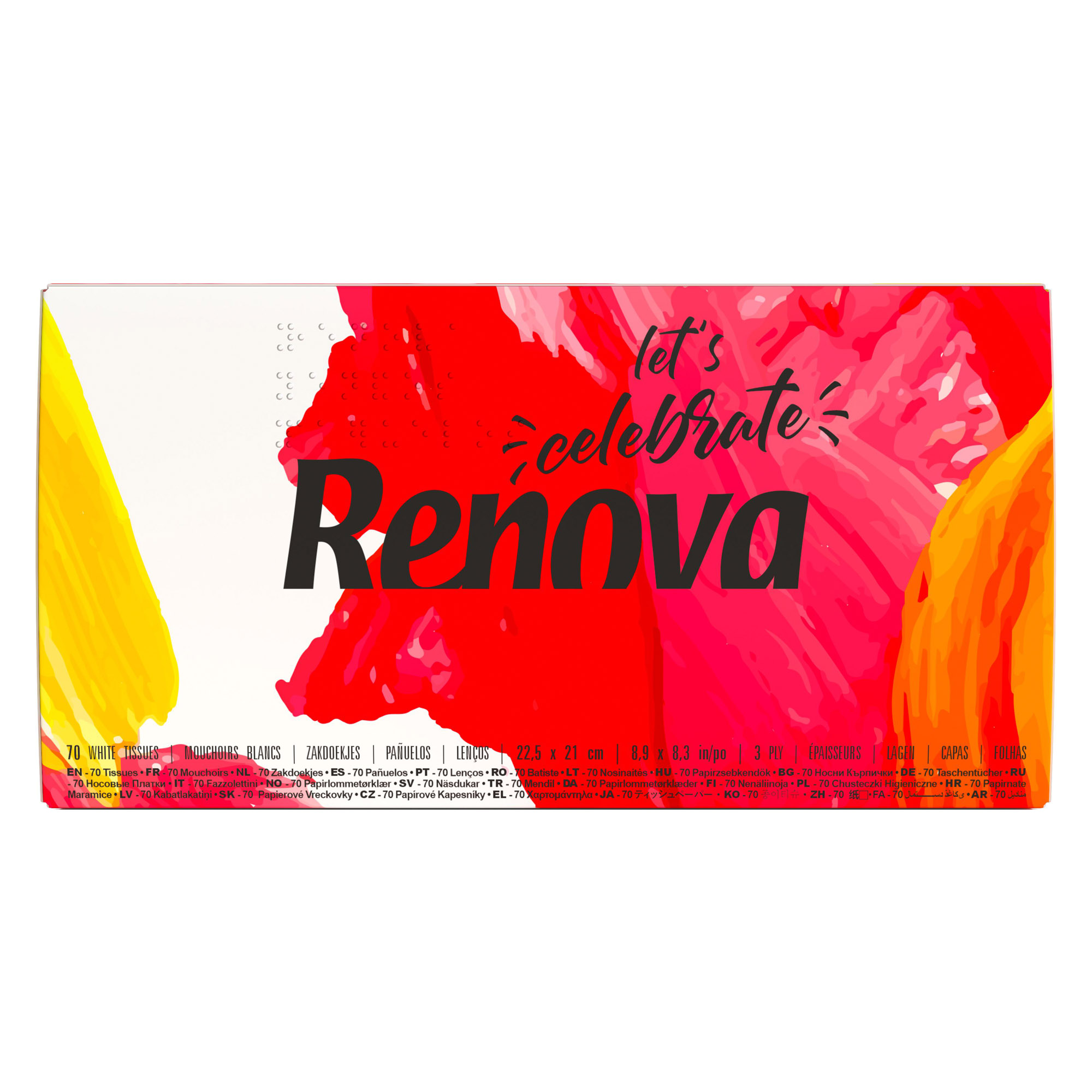 Renova Festive, doos van 70 tissues voor het hele gezin. Ultra-zacht en absorberend, het is een kleurrijk feest!