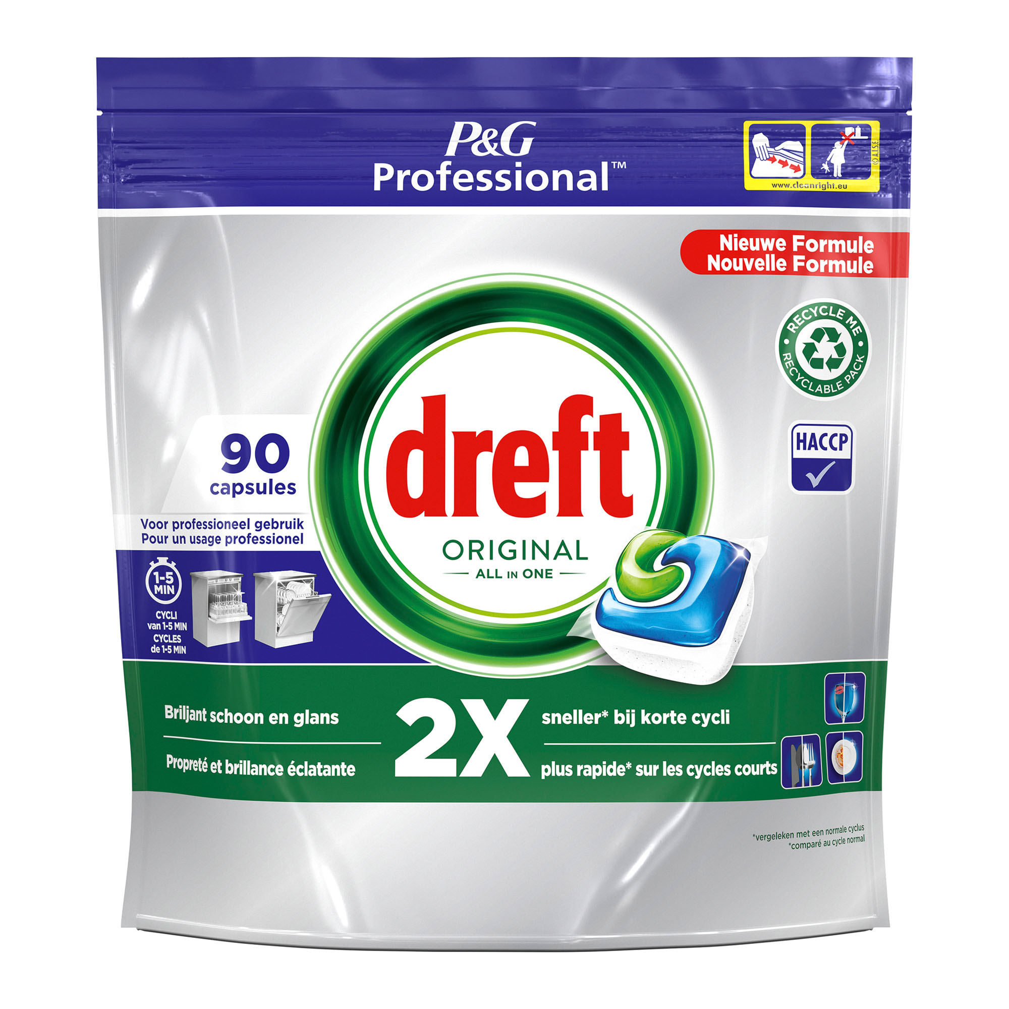 ProductinformatieDreft Original Regular All in 1 : de kracht van Dreft. Krachtige ontvetter. Briljant schoon en glans 2 x sneller bij korte cycli (vergeleken met een normale cyclus). Voor professioneel gebruik. Zak met 90 doses.