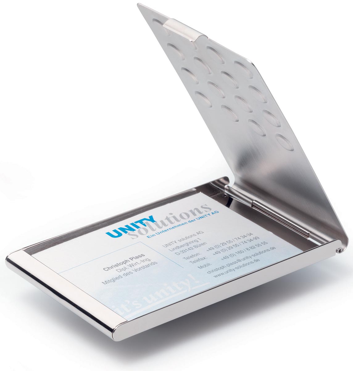ProductinformatieElegante visitekaartdoosje uit een metalen legering, met een hoogwaardig Chroomlaag in een modern design. voor een optimale bescherming. Voor max. 20 visitekaarten, tot het formaat 95 x 58 mm.
