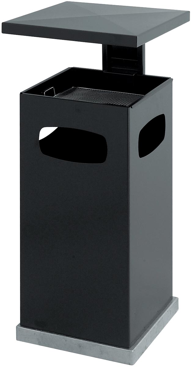 Stalen as-papierbak met afneembaar afdak en drie inworp openingen Voorzien van verzinkte binnenemmer, zwarte inzetbak en verchroomde zeef Inclusief bevestigingsmateriaal voor vloermontage Inhoud: 70 l Ft 39,5 x 39,5 x 91 cm Kleur: zwart