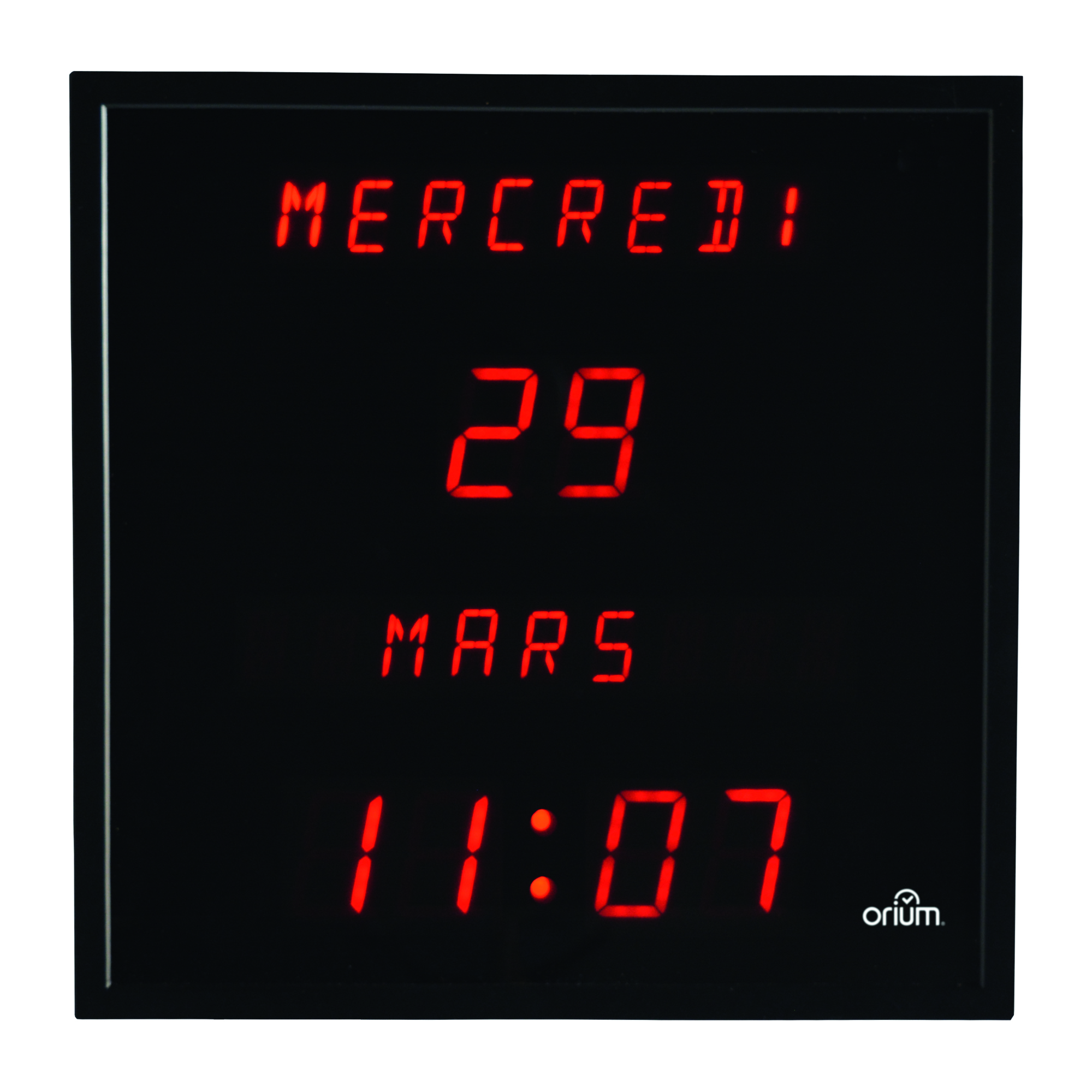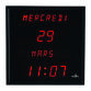 Zichtbaar op 30 m. Elektrische, digitale klok kleur zwart met rode LED-weergave (datum en uur). Opgelet: enkel Franse teksten, Nederlands teksten zijn niet programmeerbaar. Automatische aanpassing van gegevens, wanneer ingeschakeld. Met batterij, zodat de gegevens niet verloren gaan wanneer de stroom onderbroken wordt. Geleverd met 1 CR2032-batterij. Materiaal: metaal en glas. Verbinding met stroomnet. Normen: CE-ROHS. Afmetingen: B 28 x H 28 x D 4,2 cm.