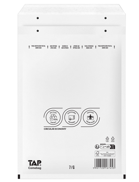 De TAP Comebag luchtkussen envelop Nr. 17 250x350mm 100 stuks biedt jou de zekerheid van een stevige, beschermende verpakking én de voordelen van een duurzame keuze. De buitenzijde is vervaardigd uit wit FSC-gecertificeerd gerecycled papier, terwijl de binnenzijde bestaat uit gerecyclede polyethyleen bubbelfolie. Deze envelop combineert uitstekende bescherming met een milieuvriendelijke samenstelling van 95% gerecycled materiaal. De zelfklevende sluiting is hersluitbaar en gebruiksvriendelijk, ideaal voor efficiënt verzenden. Bovendien zijn binnen- en buitenlagen eenvoudig van elkaar te scheiden voor optimale afvalscheiding. Perfect voor wie duurzaam én professioneel wil verzenden.Kenmerken:* Type: luchtkussen envelop Nr. 17.* Buitenmaat: 250x350mm.* Binnenmaat: 230x340mm.* Kleur: wit.* Verpakking: 100 stuks.* Materiaal: 95% gerecycled (papier 100%, folie 91%).* Eigenschap: zelfklevend en hersluitbaar.* Duurzaamheid: gemakkelijk te scheiden voor milieuvriendelijke afvalverwerking.