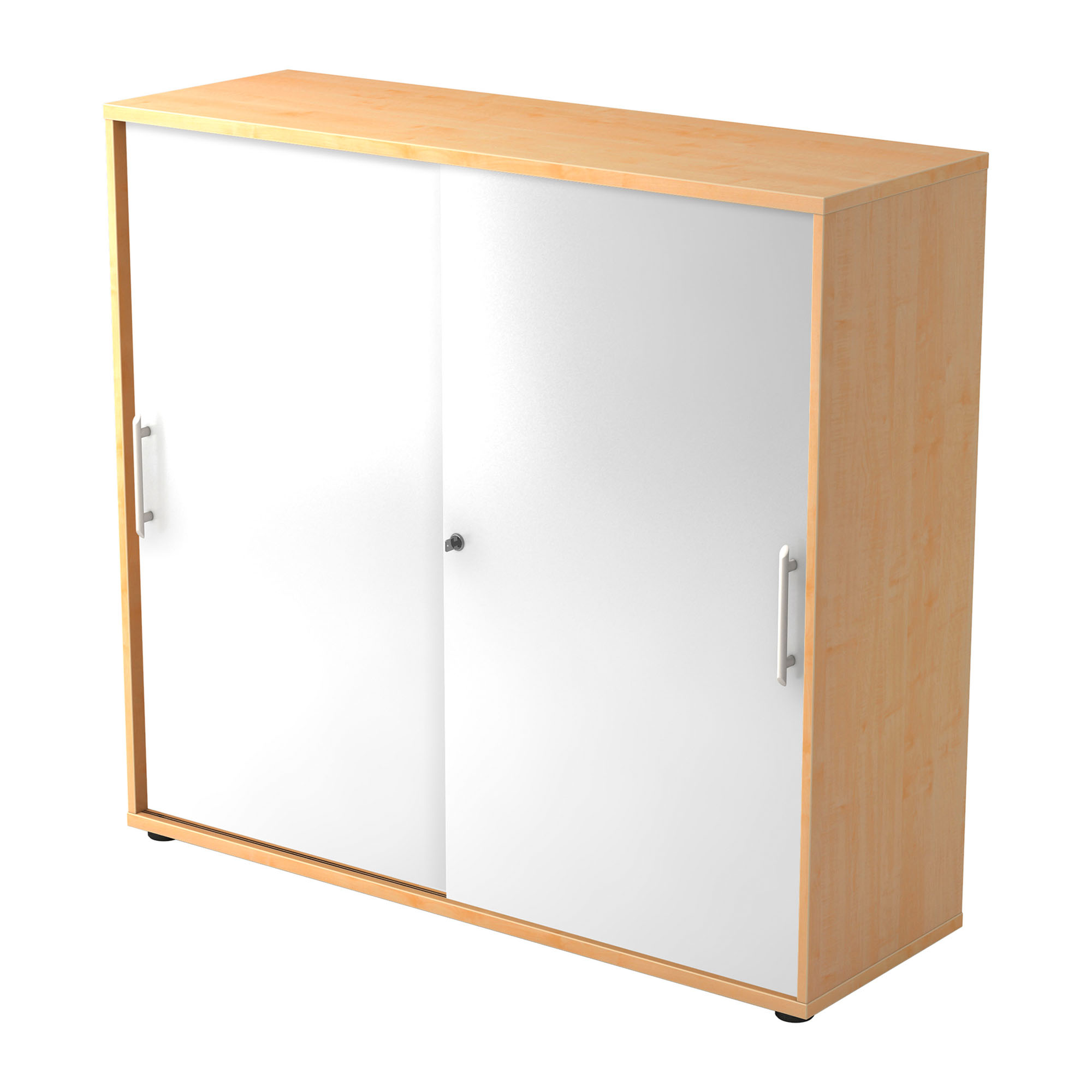 Structuur : spaanplaat bekleed met melaminelaag (DIN 68765 - Klasse E1). Voorzijde met 2 mm dikke beschermstrook in ABS, afgerond. Dikte zijkant: 16 mm, dikte boven- en onderkant: 22 mm. Rug: 3 mm (in groeven vastgeschroefd) - steeds zilverkleurig.Sluiting: loopgedeelte "Slide Line" onderaan op 2 wieltjes per deur in een geleider (met hoogteregeling) - bovenaan met 2 blokjes per deur in een geleider.Uitrusting: legplanken dikte: 16 mm, voorzijde met 2 mm dikke beschermstrook in ABS, afgerond. Hoogte is verstelbaar per 32 mm.Sokkel: 5 ronde pootjes (zwart - H 20 mm), bovenaan via de bodem in hoogte verstelbaar.Slot: drukcilinderslot, standaard sluiten beide deuren tegelijk (op aanvraag kan voor elke deur apart een slot bekomen worden).Handvat: zilverkleurig in kunststof, 128 mm. Draagvermogen: 25 kg/legplank.
