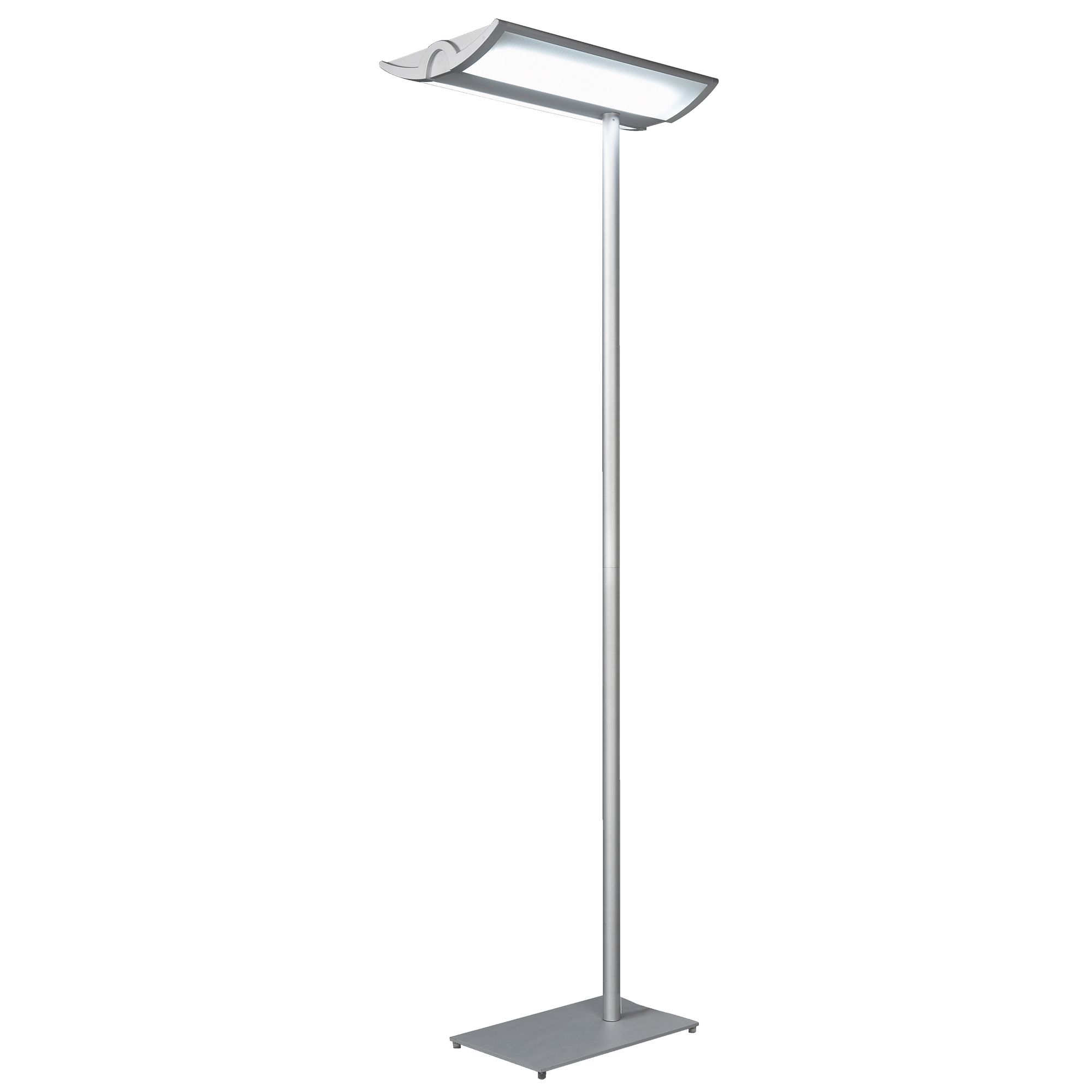 Geleverd met 4 TL buizen fitting 2G11. Vermogen 220 W. Dubbele verlichting direct / indirect met opalen diffusor. Reflector. Schakelaar en dimmer op de kop. H 192 cm, sokkel B 42 x D 28 cm. Sokkel gewogen cast, schacht aluminium gelakt metaal, kop aluminium metaal en plexiglas.