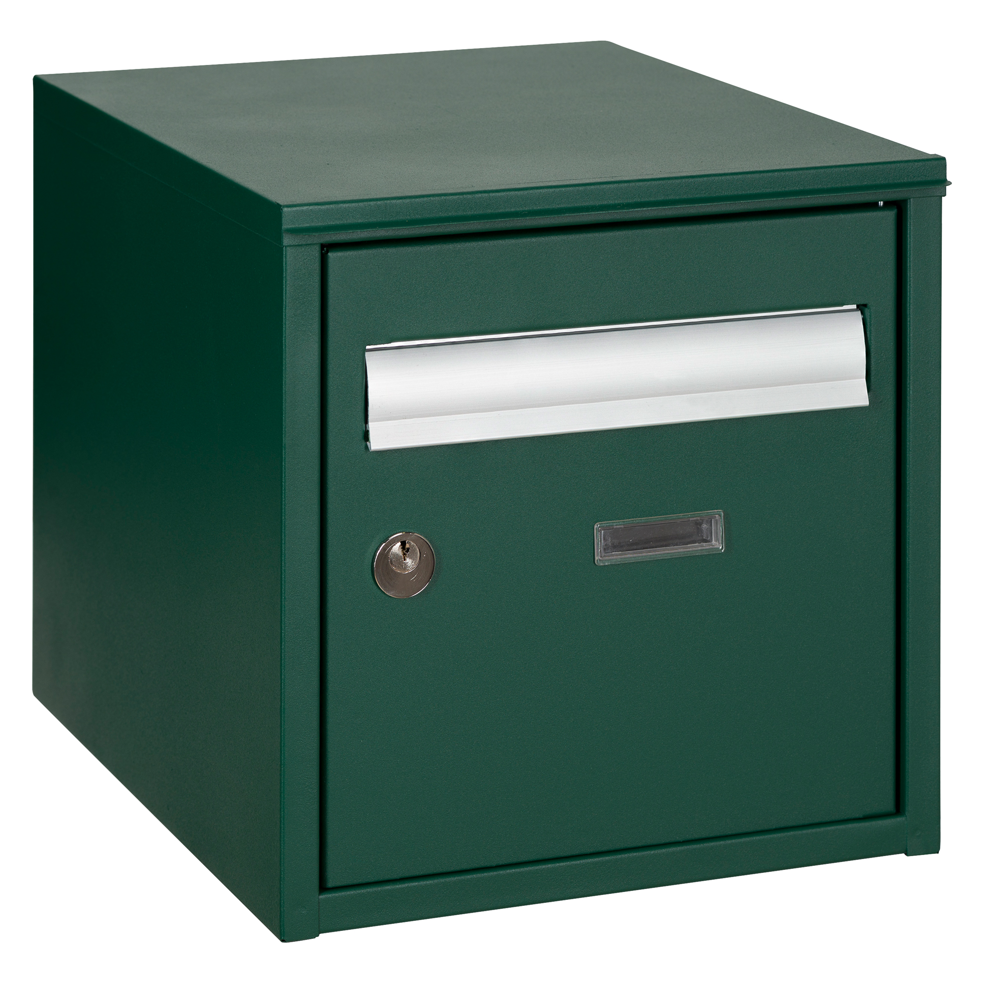 Voor binnen of buiten. Om neer te zetten, in een nis te steken of vast te maken op een paal (optioneel). Deur gaat volledig open. Met venster voor het invoeren van de post (23,5 x 3 cm), met klepje in aluminium. Conform de norm NFD 27405. Bestand tegen slechte weersomstandigheden klasse B, en inbraak klasse E. Geen opening aan de achterkant. Genormaliseerd slot. In staal en polyester. Kleur: groen of beige. Afmetingen van brievenbus: H 32 x B 32 x D 40 cm. Afmetingen van paal (optioneel): H 110 x B 3,5 x D 3,5 cm.