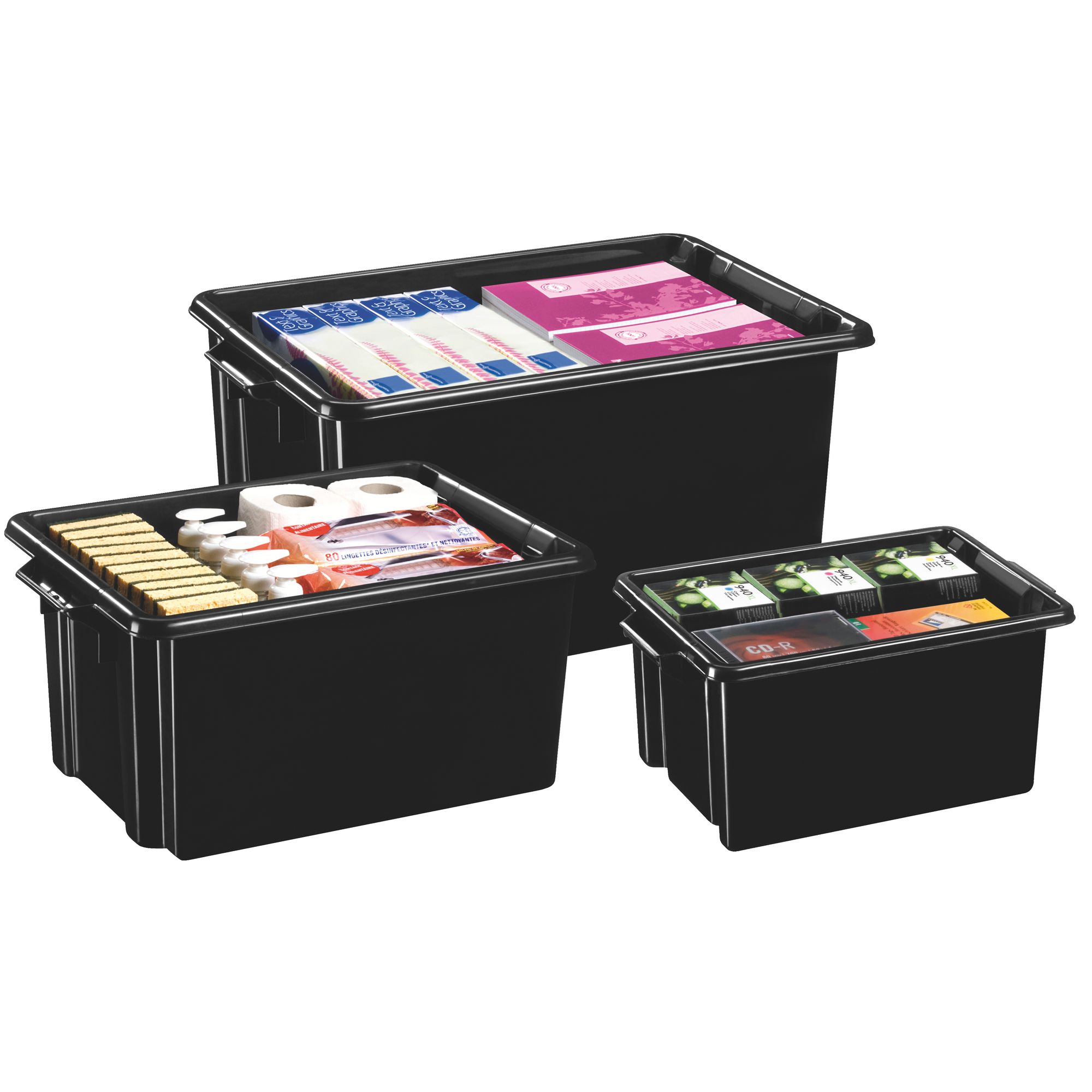 Capaciteit: 48,5 l. Hoge robuustheid: versterkte, dikke wanden met versteviging op beide zijden van de kisten. Onderkant onderverdeeld. Grote handvaten op de rand. Makkelijk te transporteren en te stapelen: afgeronde verstevigde handvaten. Stapelbaar wanneer de kistenvol zijn en als ze leeg zijn, kan je ze in elkaar schuiven. Dit product is vervaardigd uit 100 % gerecycleerd materiaal (100% gerecycleerd polypropyleen). De kleur van de kisten kan lichtjes verschillen afhankelijk van de fabricatie. Binnenafmetingen: H 26 x W 47 x D 33,6 cm. Buitenafmetingen: H 28,3 x B 60,1 x D 39,1 cm.