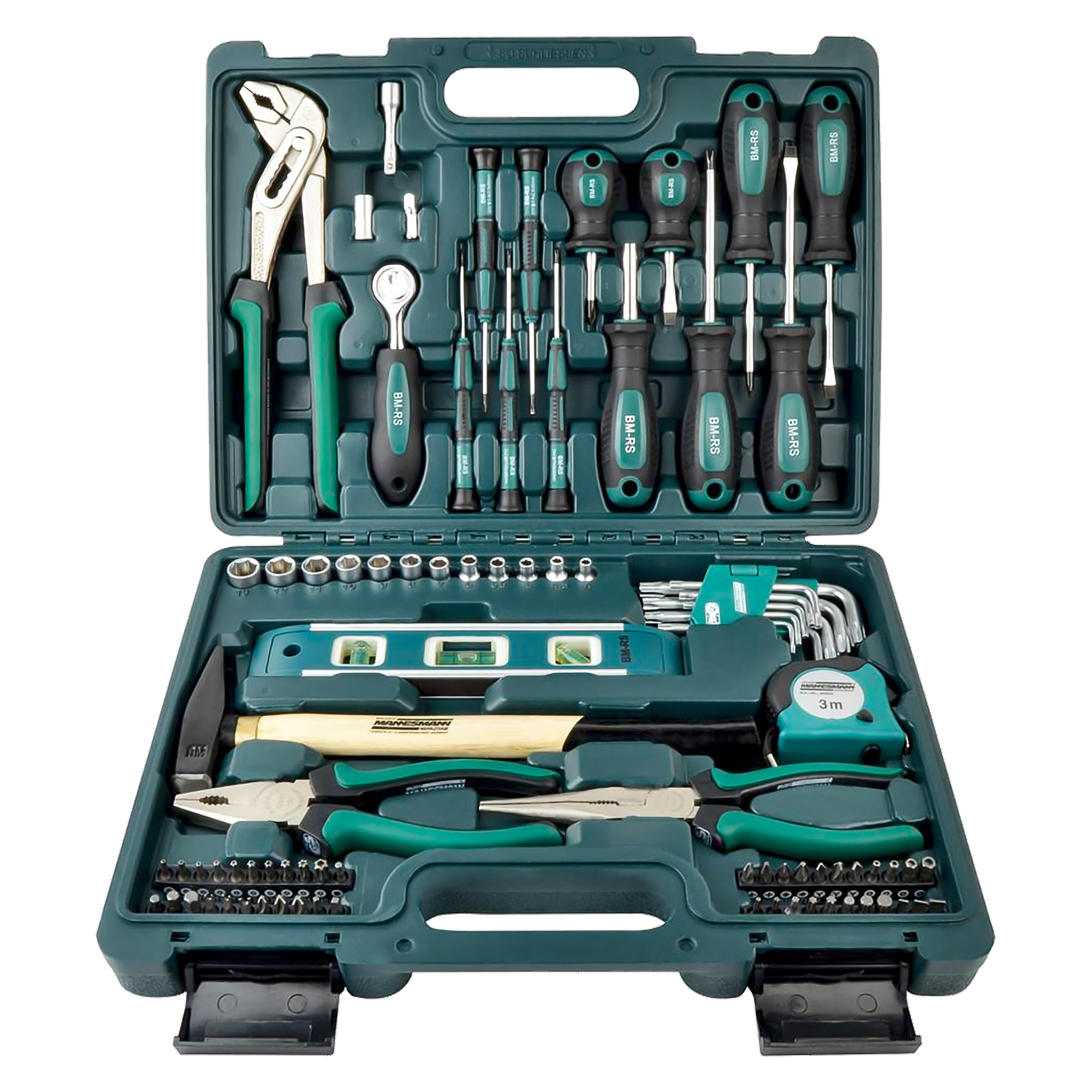 Inhoud: 12 x dopsleutel, 1 x waterpomptang, 1 x ratel, 5 x fijnmechanische schroevendraaier, 6 x schroevendraaier, 1 x schroevendraaiergreep, 9 x T-profielsleutel, 1 x draaikoppeling, 1 x bankhamer, 1 x universele tang, 1 x telefoontang, 1 x verlengsnoer, 1 x stekkeradapter, 1 x 3 m meetlint, torpedowaterpas, 44 x bits.