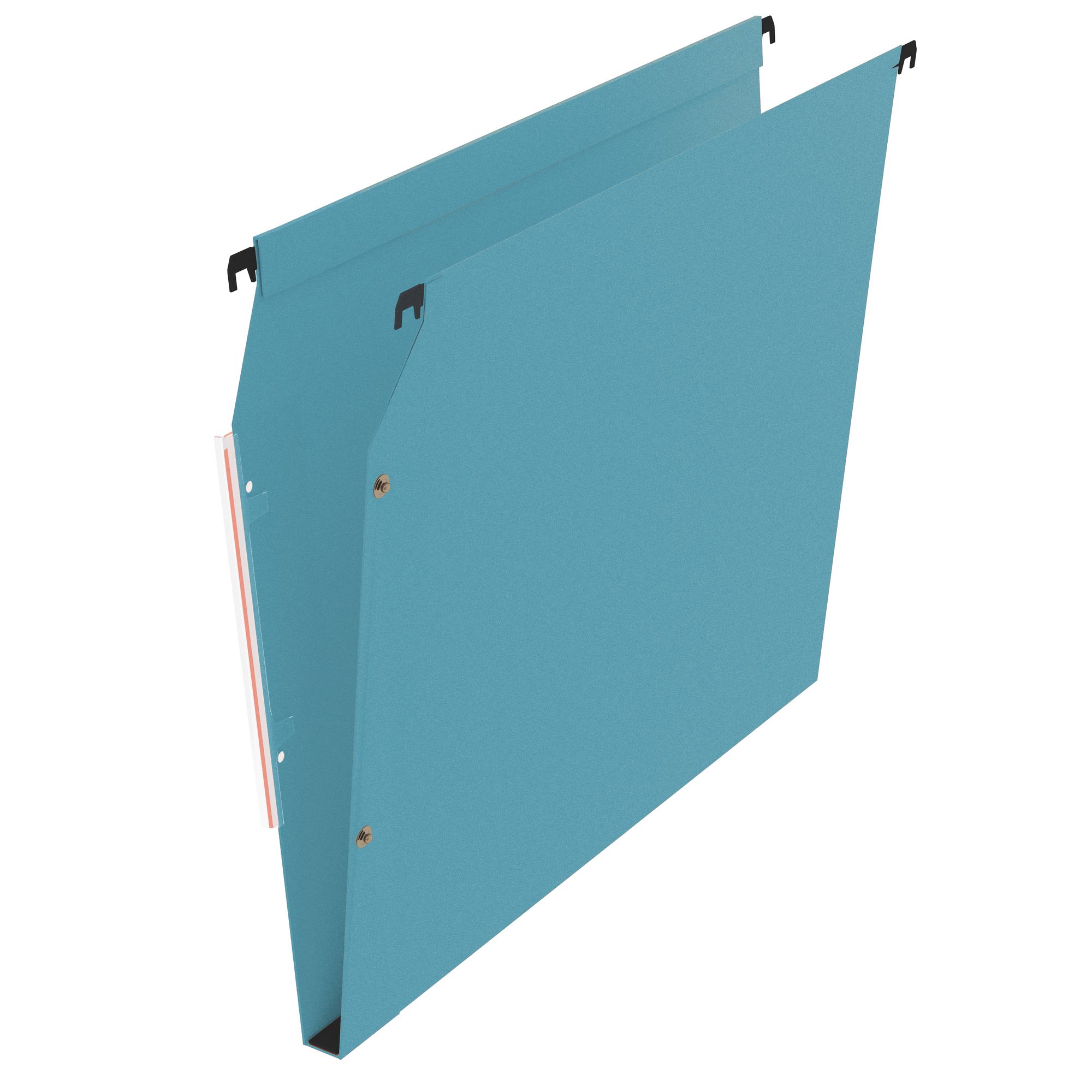 Voor kasten. Etikethouder met vergrotend effect (etiketten zijn inbegrepen). Gemengd continusysteem met flap en metalen drukknoppen, voor een universele compatibiliteit. Ophangstangen met plastic uiteinden. Kraftkarton 220 g. Formaat 24 x 32 cm. Asafstand 33 cm. Bodem 30 mm. 4 beschikbare kleuren: blauw, rood, geel, groen.