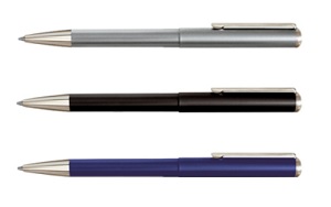 Balpen met een geïntegreerde stempel. Afwerking: zilver, blauw of zwart. Trendy zwarte etui en blauwe inktvulling inbegrepen in de prijs. Voor gravure op de dop van deze balpen moet u ref 400485 valideren en daarna de personalisatie definiëren.