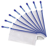 ProductinformatieIn versterkt flexibel PVC, transparant, metalen ritssluitingen gekleurde gripband, dikte: 230 micron,binnenafmetingen: 235 x 100 mm, buitenafmetingen: 250 x 115 mm.