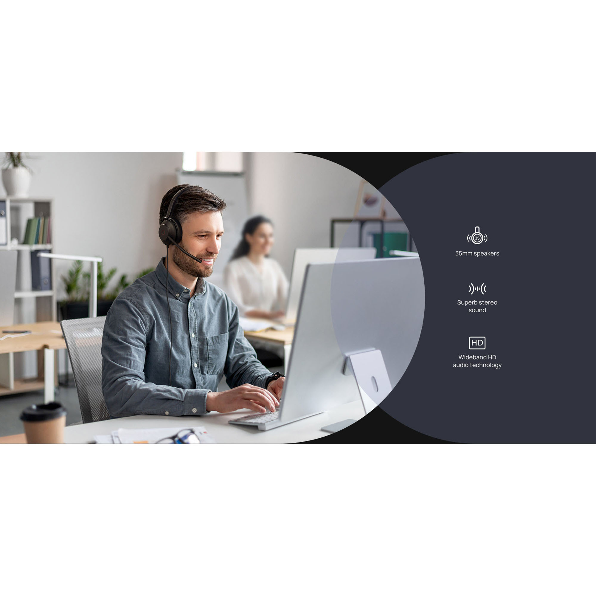 De UH35 koptelefoon is ontworpen om u het beste comfort te bieden: lichtgewicht (96,5 g), hoofdband en oorkussen van leder met schuimvulling, een lange USB-kabel van 1,5 m (USB-A of USB-C verbinding).