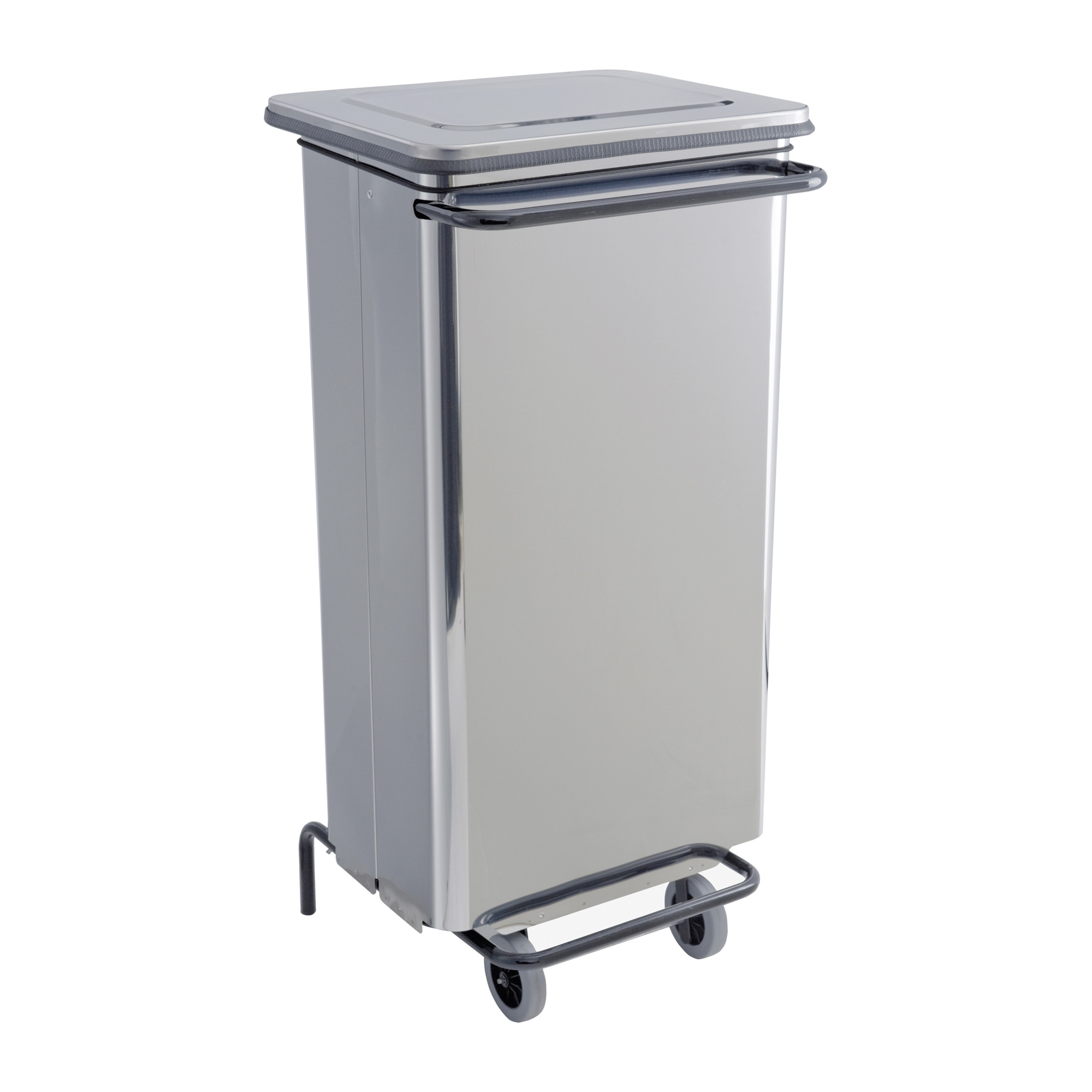 Geschikt voor gebruik in ziekenhuizen of keukens. Breed handvat voor een betere wendbaarheid. Brede pedaal voor opening. Wieltjes Ø 9,5 cm. Een elastieken band houdt de zak op zijn plaats. Omhulsel en deksel in wit gepoederd staal. Rubberen band terug bescherming van het deksel. Capaciteit: 110 l. Afmetingen: H 96 cm x B 48 cm x D 45,5 cm. Voor zakken van 130 l.