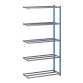 Gebruikt als basiselement of als aanbouwelement is het een efficiënte oplossing voor het vereenvoudigen van de opslag: zijn metalen buisvormige planken (=liggers) : 5 in totaal zijn in hoogte verstelbaar per 2,5 cm. Dankzij de kunststof einddoppen beschermt dit model de vloer tegen het gewicht van de stelling.