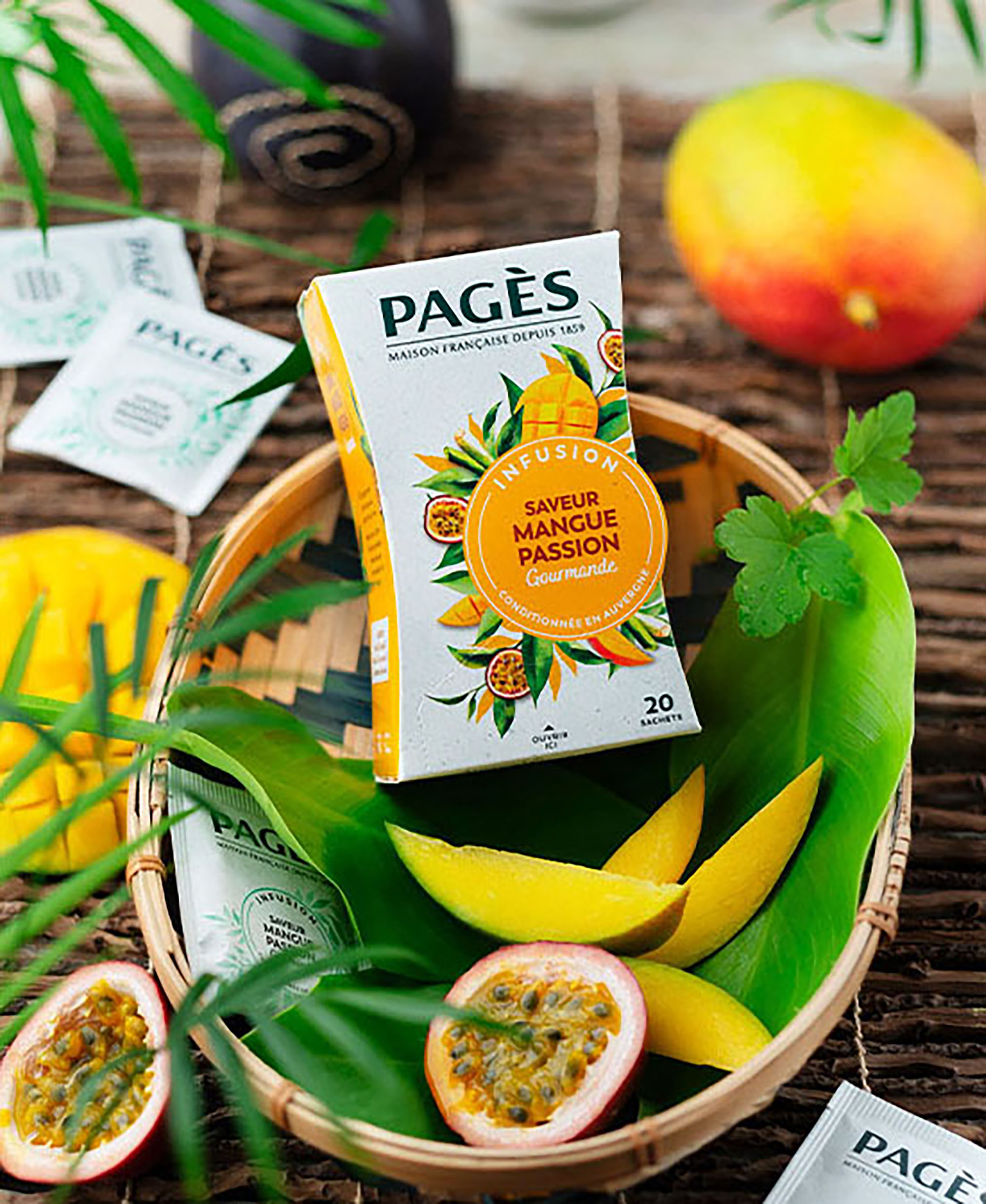 ProductinformatiePagès biedt een originele creatie aan met fruitige smaken van Mango en Passievrucht. Gecombineerd met Maté, Citroengras en Rooibos, deze exotische tonen prikkelen de smaakpapillen voor een smaakvol moment dat reizen oproept, met infusie.Doos van 20 zakjes.